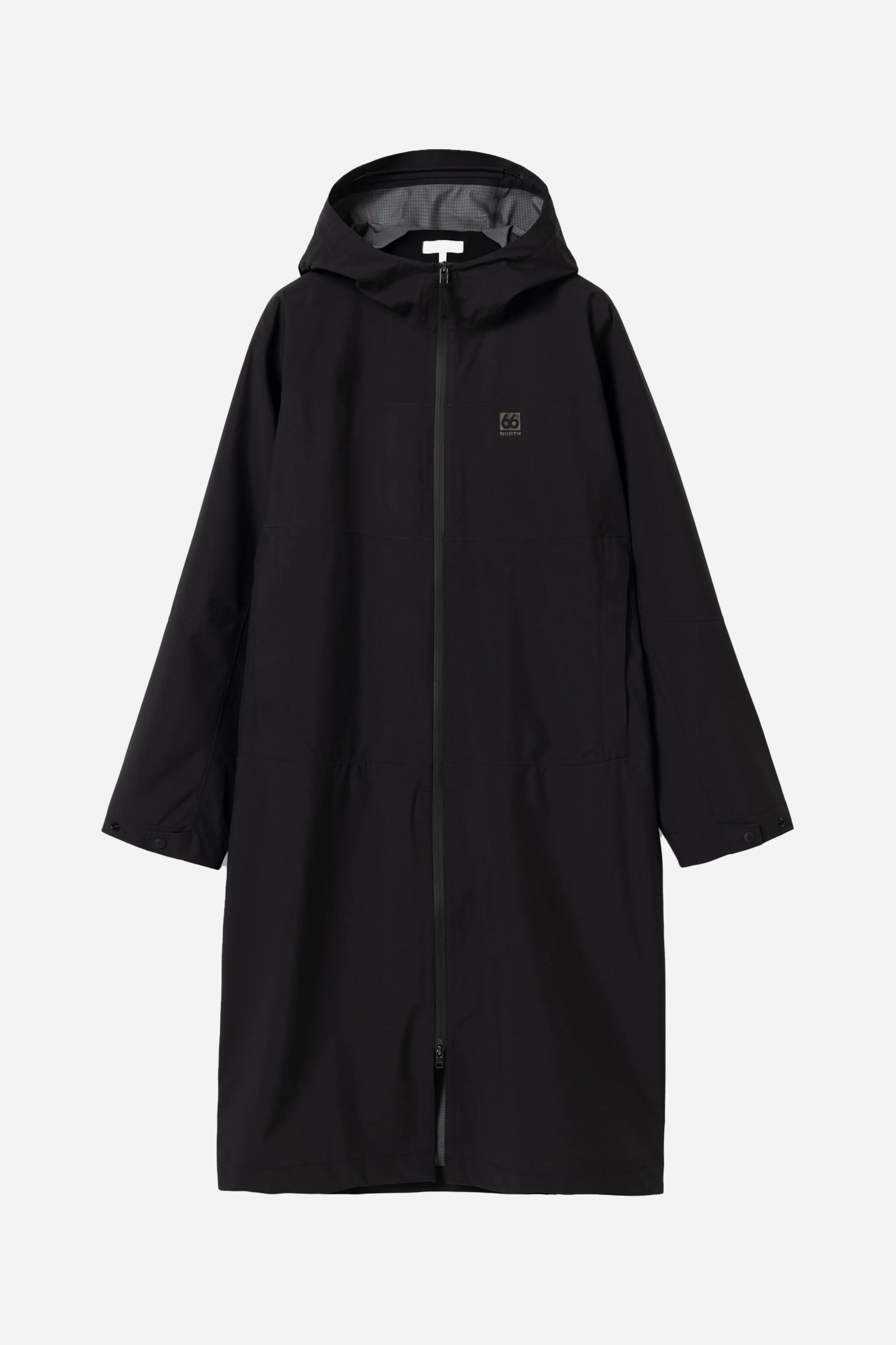 Adalvik Packable Rain Coat Black fra 66°North. Denne frakke er fremstillet i Polyester. Denne jakke er designet i en lang, normaltsiddende pasform, med hætte, sidelommer der lukkes med lynlås, og elastik i manchetten. Jakken lukkes med lynlås fortil, og har et 66°North logo på venstre bryst. Jakken kan foldes sammen i medfølgende pose.