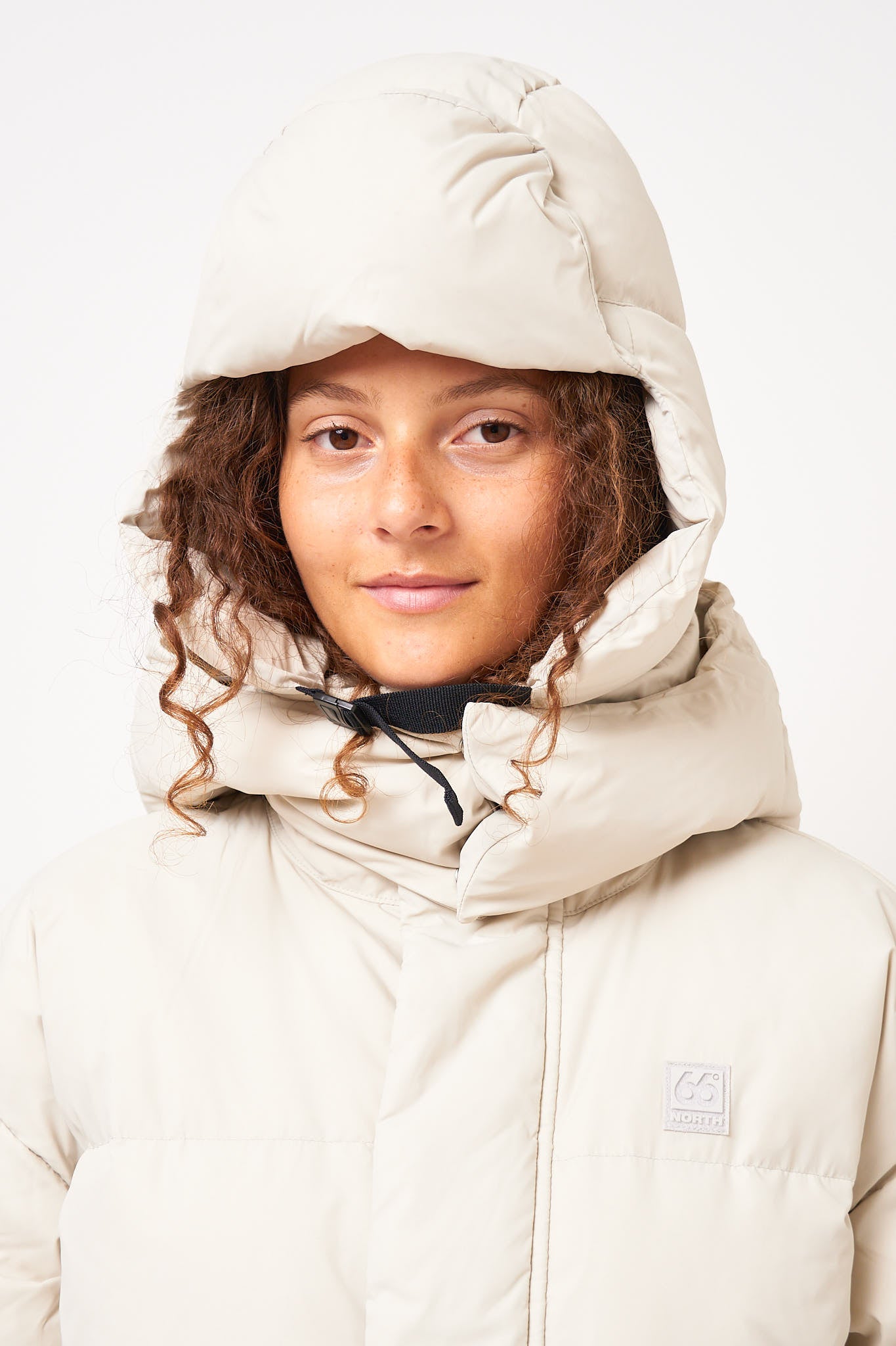 Dyngja Puffy Hat Dark Stone fra 66°North. Denne hat er fremstillet i polyamid. Den er designet med fold fortil, lange øre, og kan lukkes og strammes om hagen.