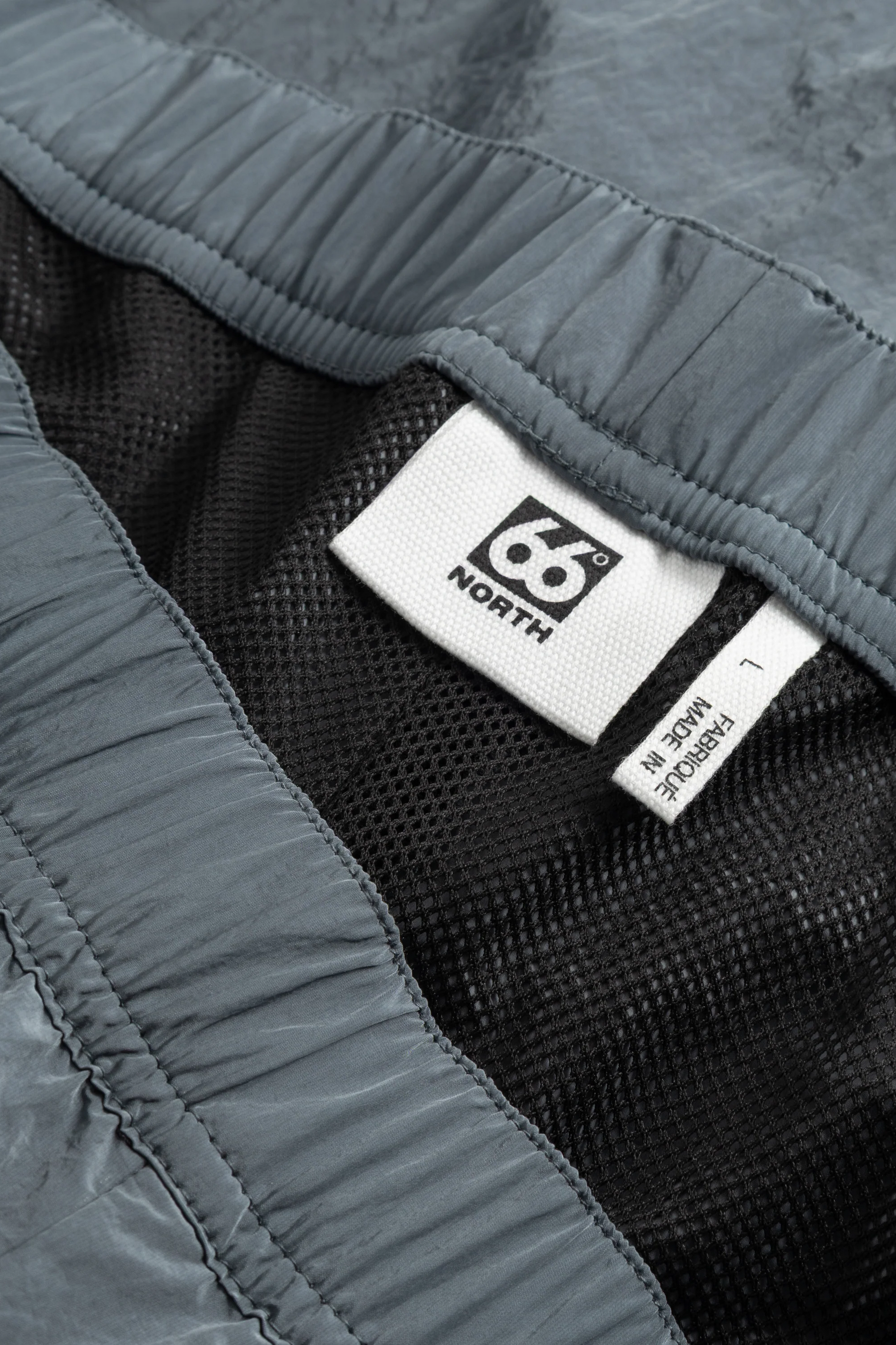 Kjalarnes Windbreaker Pants Blue fra 66°North. Disse bukser er fremstillet i nylon. De er designet i en normal ligebenet pasform, sidelommer, en baglomme og lomme lomme på højre ben der lukkes med lynlås, og elastik i livet.