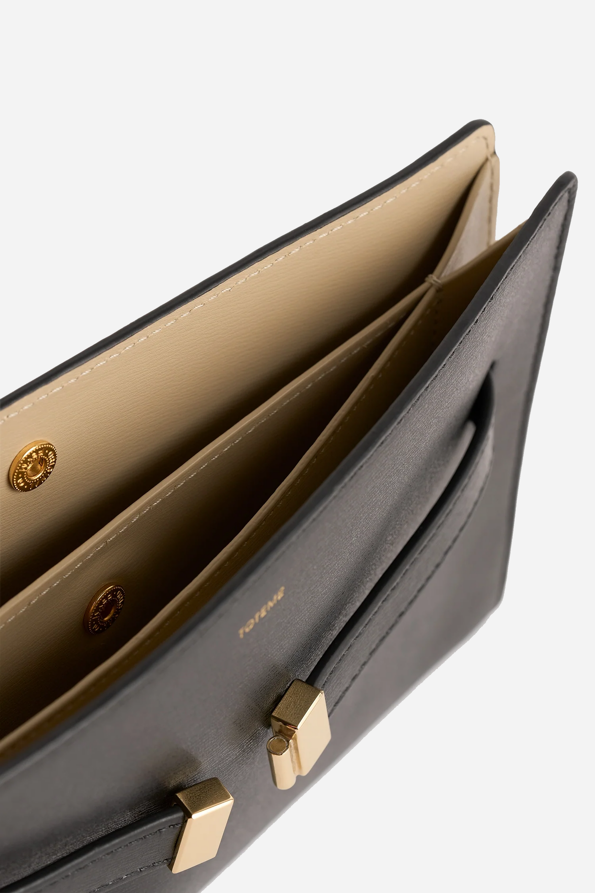 Belted Leather Crossbody Black fra TOTEME. Denne taske er fremstillet i læder. Tasken er designet med en lås fortil. Den indeholder to større rum der lukkes med trykknapper, og en justerbar strop.