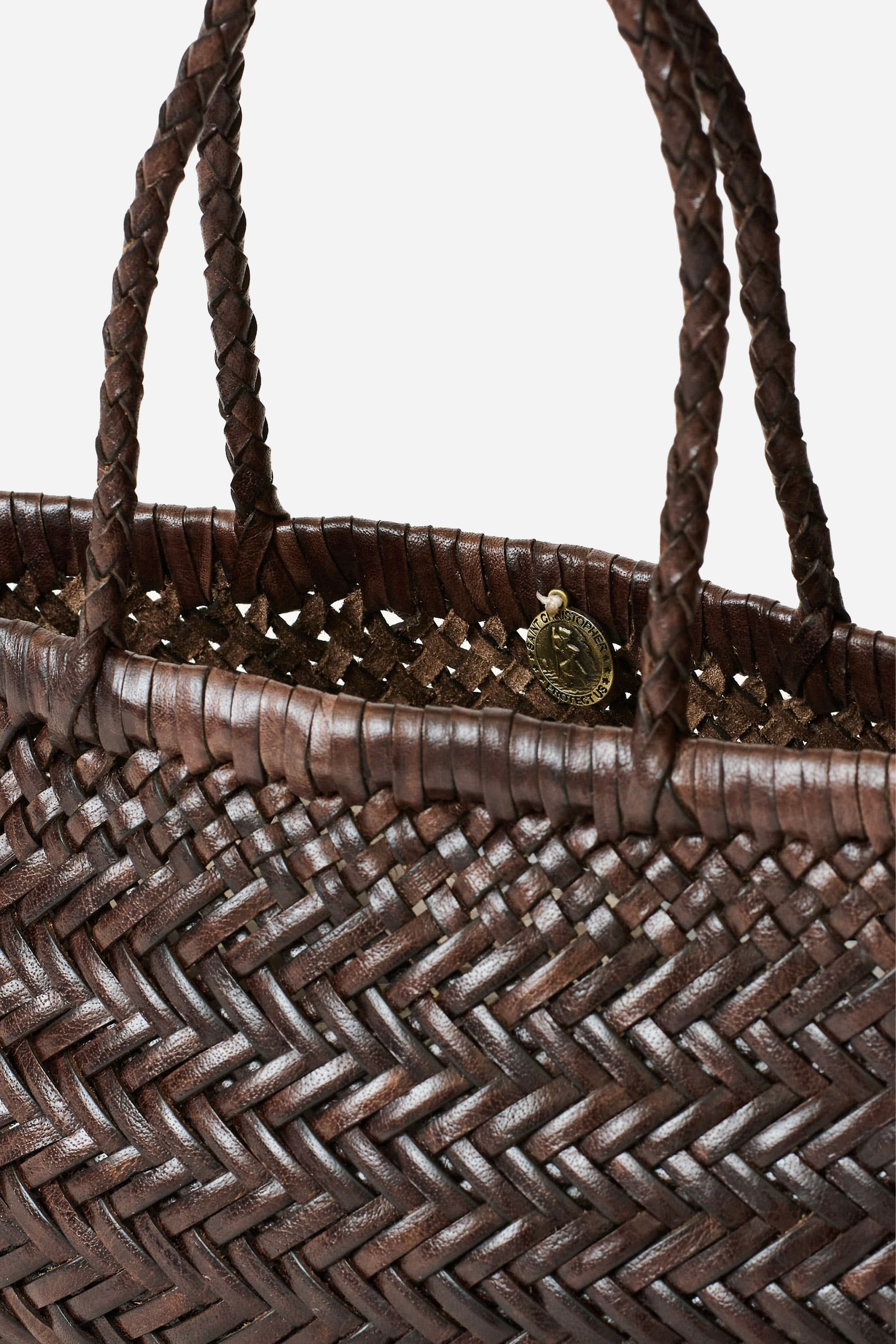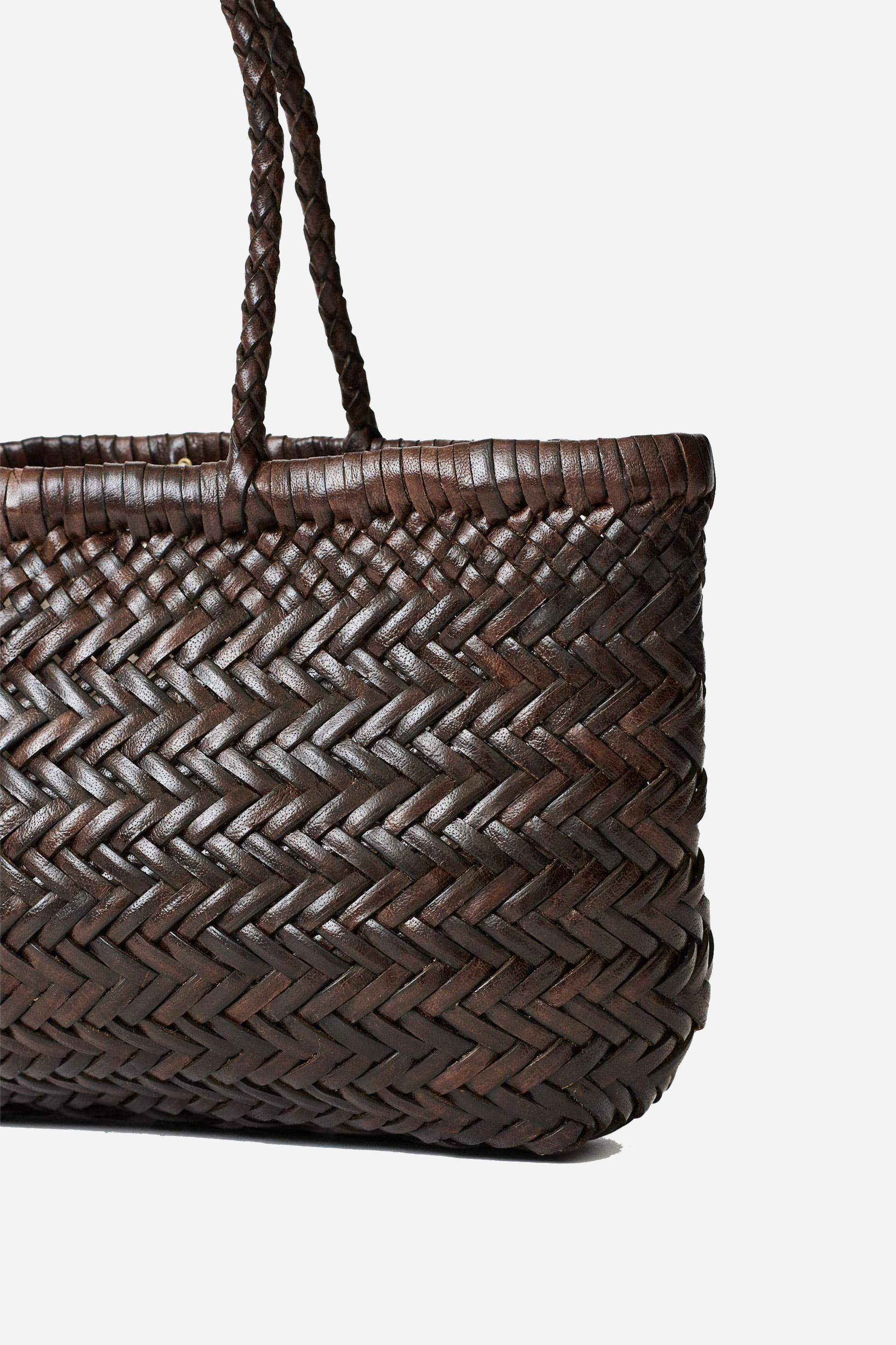 Mini Flat Gora Dark Brown fra Dragon Diffusion. Denne taske er håndlavet i Indien og er designet i flettet læder. Tasken har et stort indvendigt rum, et vedhæng og to stropper.