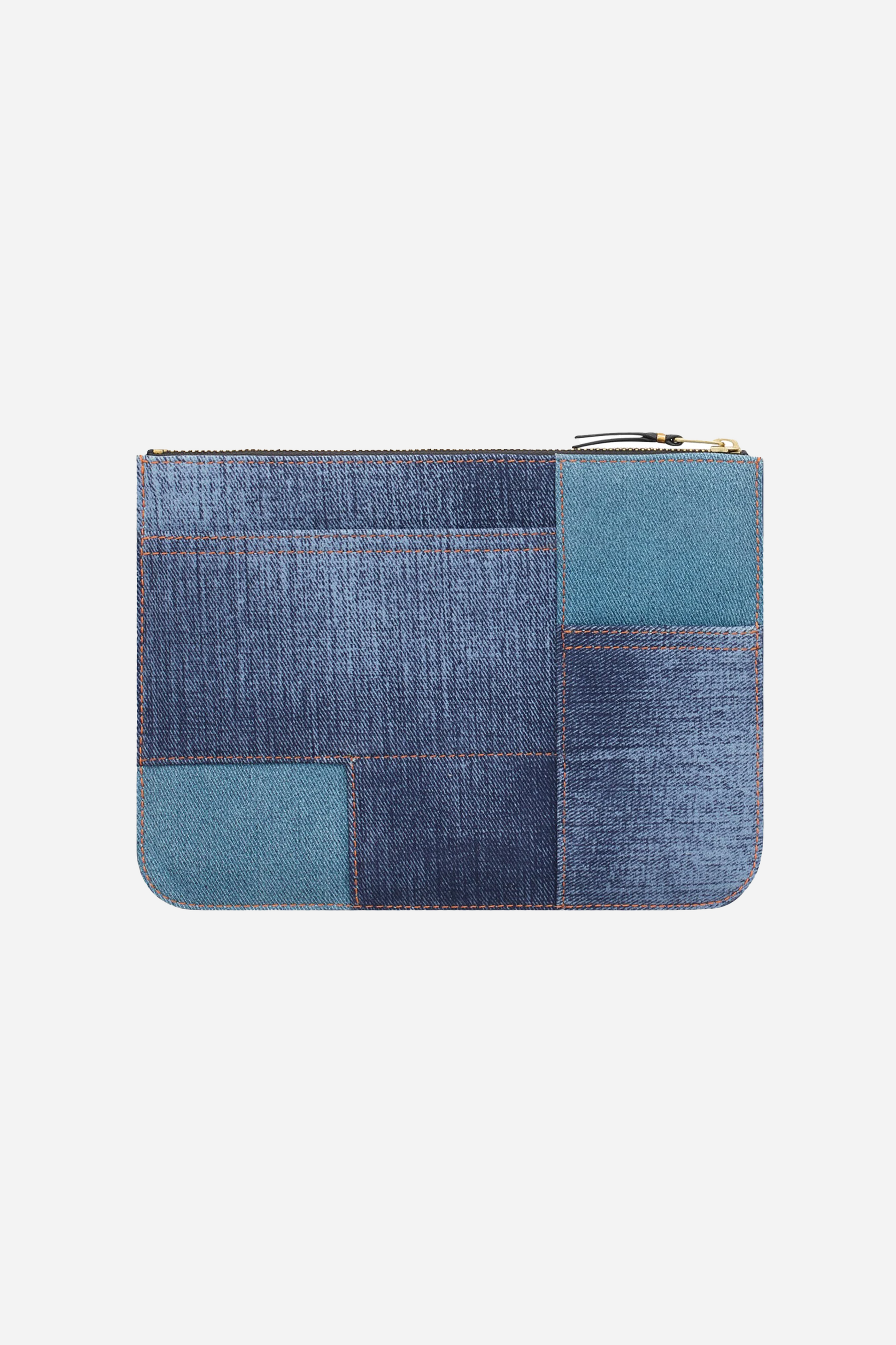 Wallet Denim Pocket Large fra Comme des Garçons Wallet. Denne pung er fremstillet i læder og denim. Den er designet med et denim patchwork. Pungen lukkes med lynlås i toppen, og har et Comme des Garçons Wallet logo fortil.