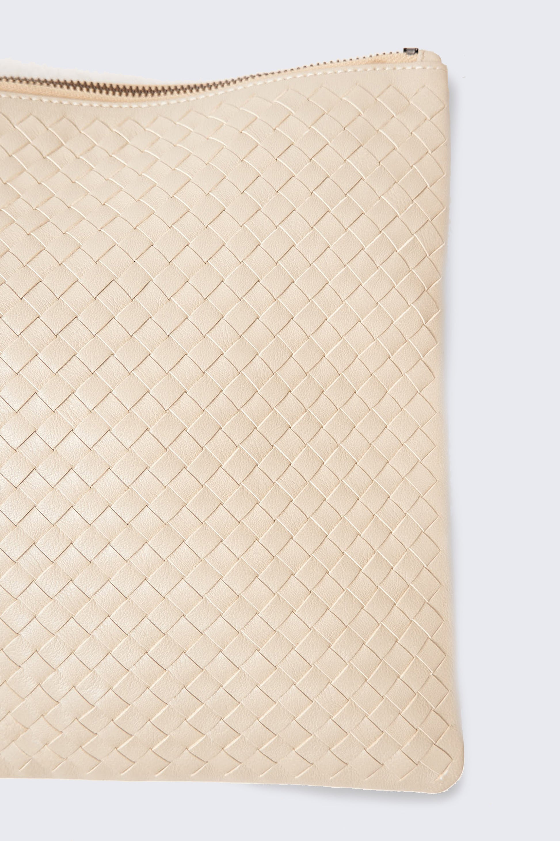 A4 Pochette Pearl fra Dragon Diffusion. Denne lille taske er håndlavet og er designet i flettet læder. Den kan anvendes som cover til en MacBook 13" og er designet med to mindre lommer indvendigt. Taksen lukkes med lynlås.
