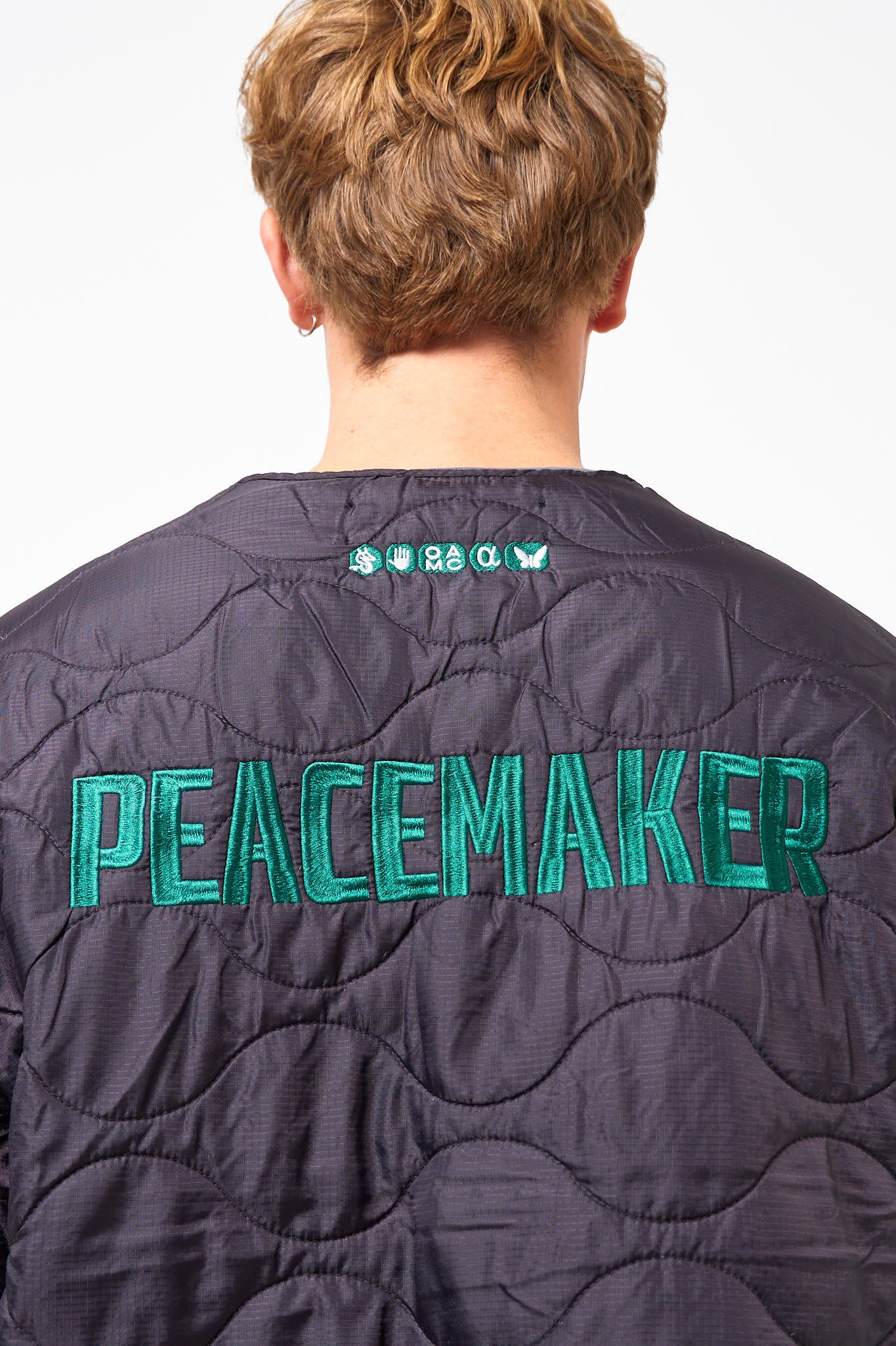 Combat Liner Black fra OAMC Peacemaker. Denne jakker er fremstillet i en skinnende polyester. Den har en dyb v-halsudskæring og lukkes med knapper. Jakken er designet med OAMC Peacemaker logo fortil og et større broderet logo på ryggen.