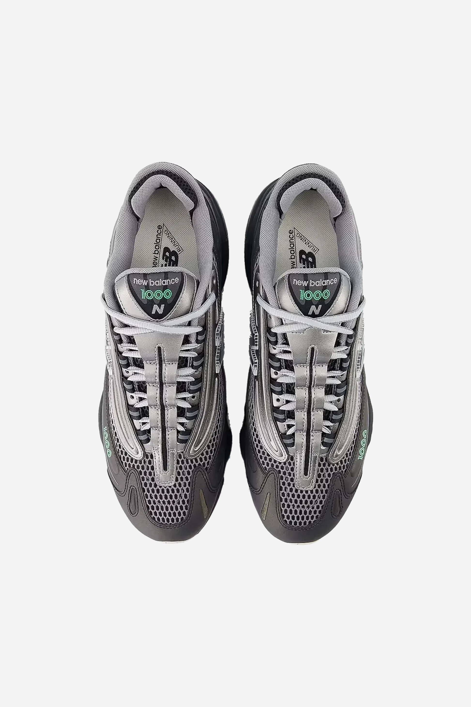 M1000T Black/Dark Silver Metallic fra New Balance. Disse sneakers er fremstillet i mesh og læder. De er designet med paneler i sølv, og et New Balance logo på hver side.