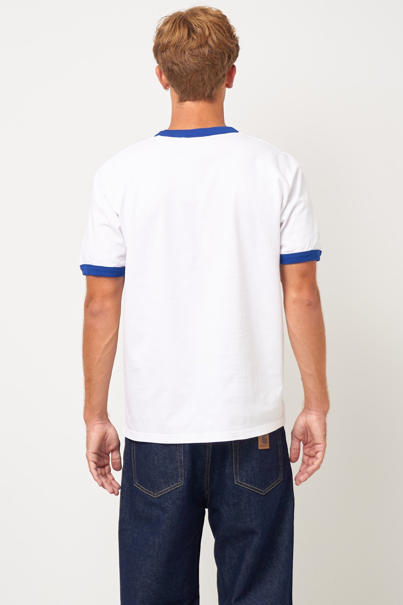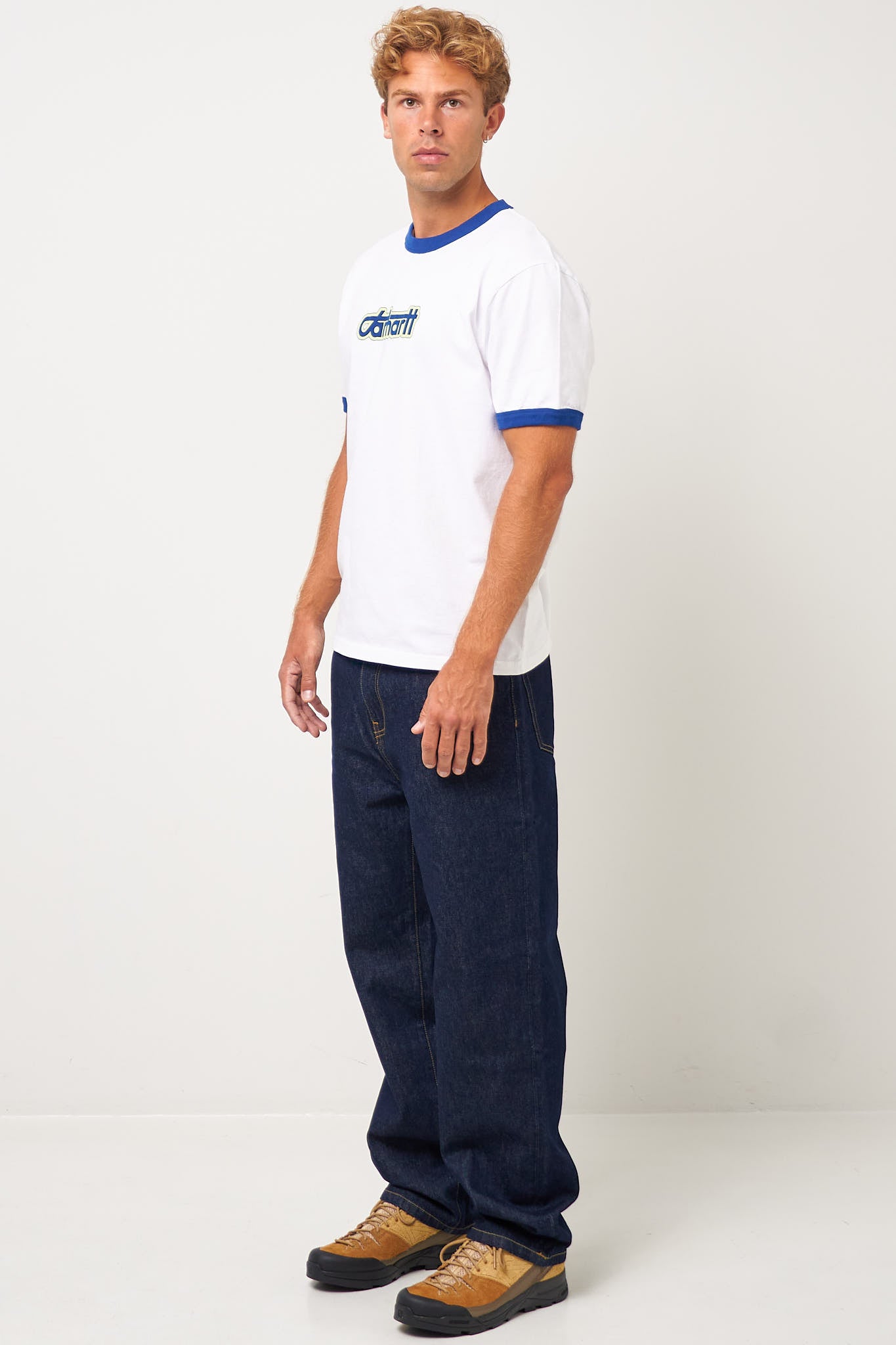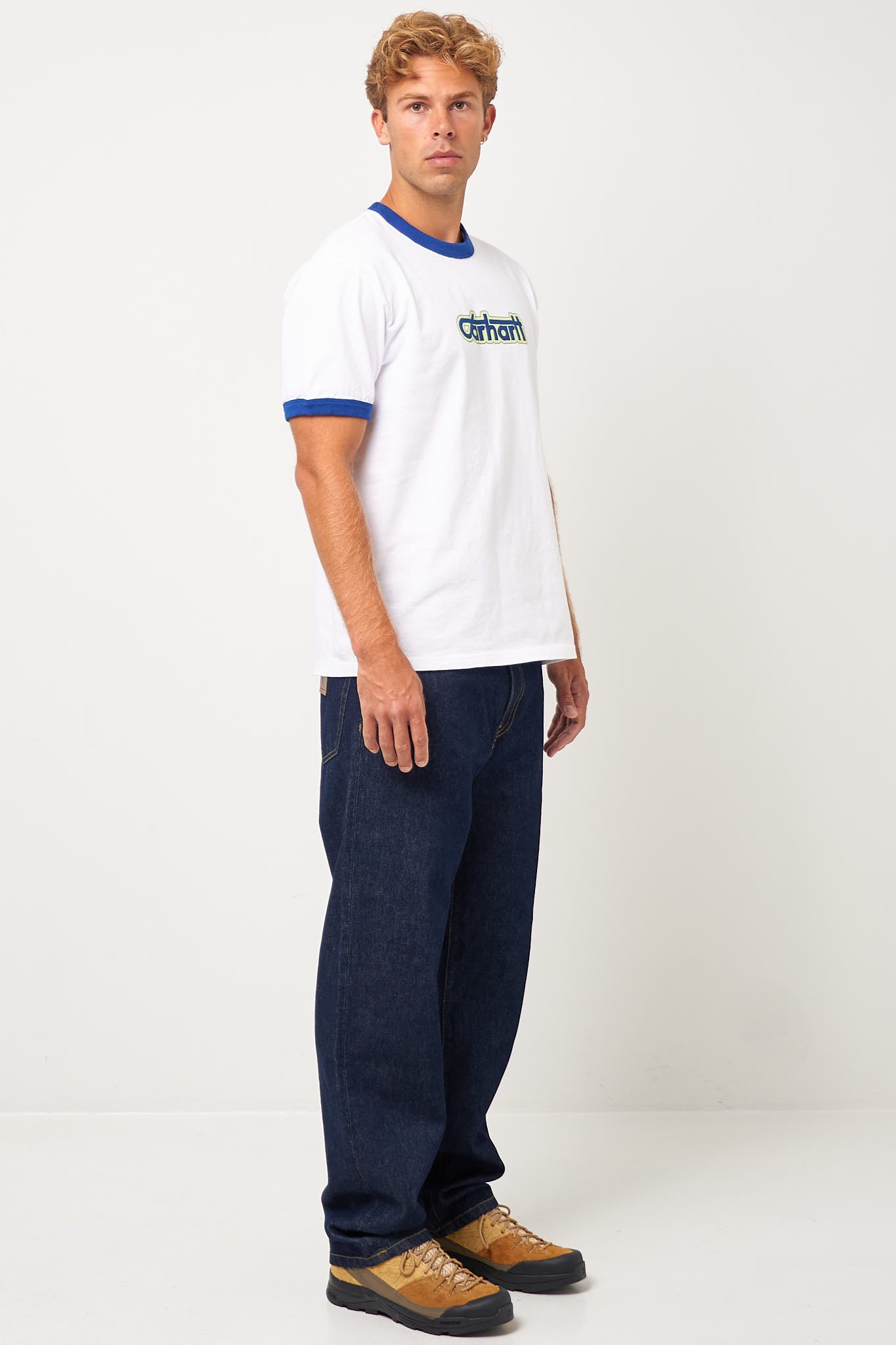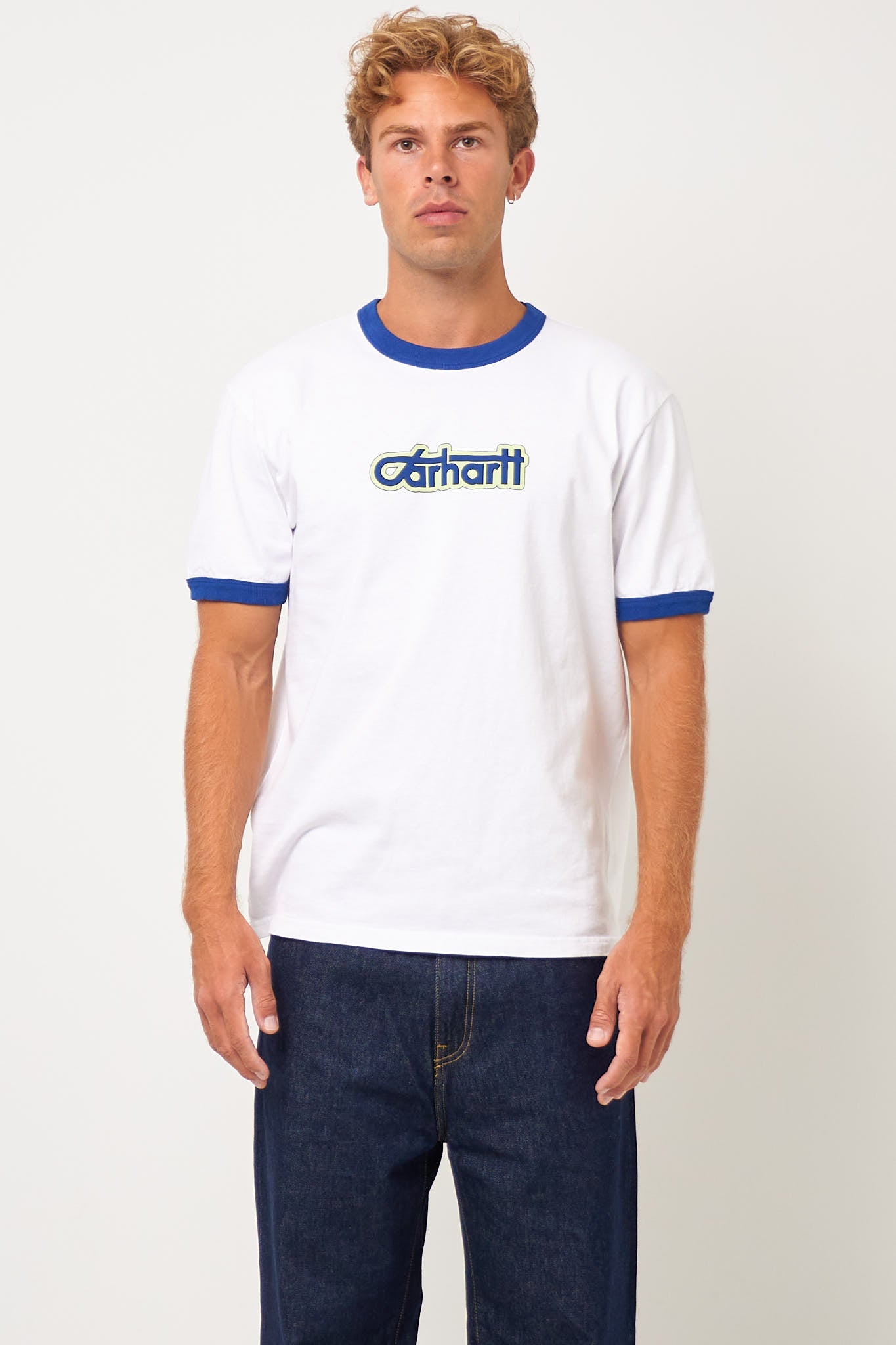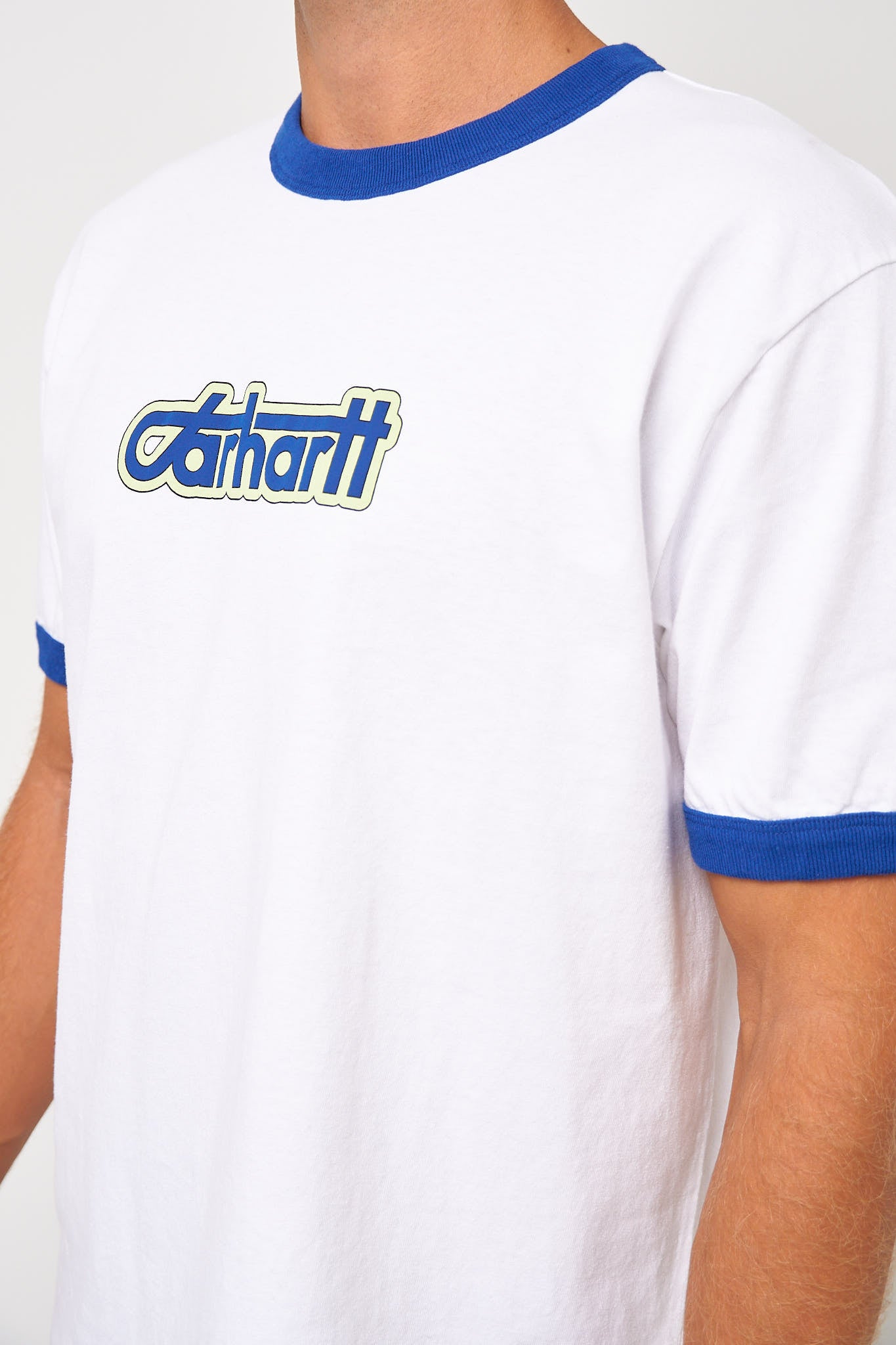 Connection Script White/Wolfsbane fra Carhartt WIP. Denne t-shirt er fremstillet i en blød bomuld. Den har en normal pasform med korte ærmer og rund halsudskæring. T-shirten har kontrast kanter og et større logo på brystet.