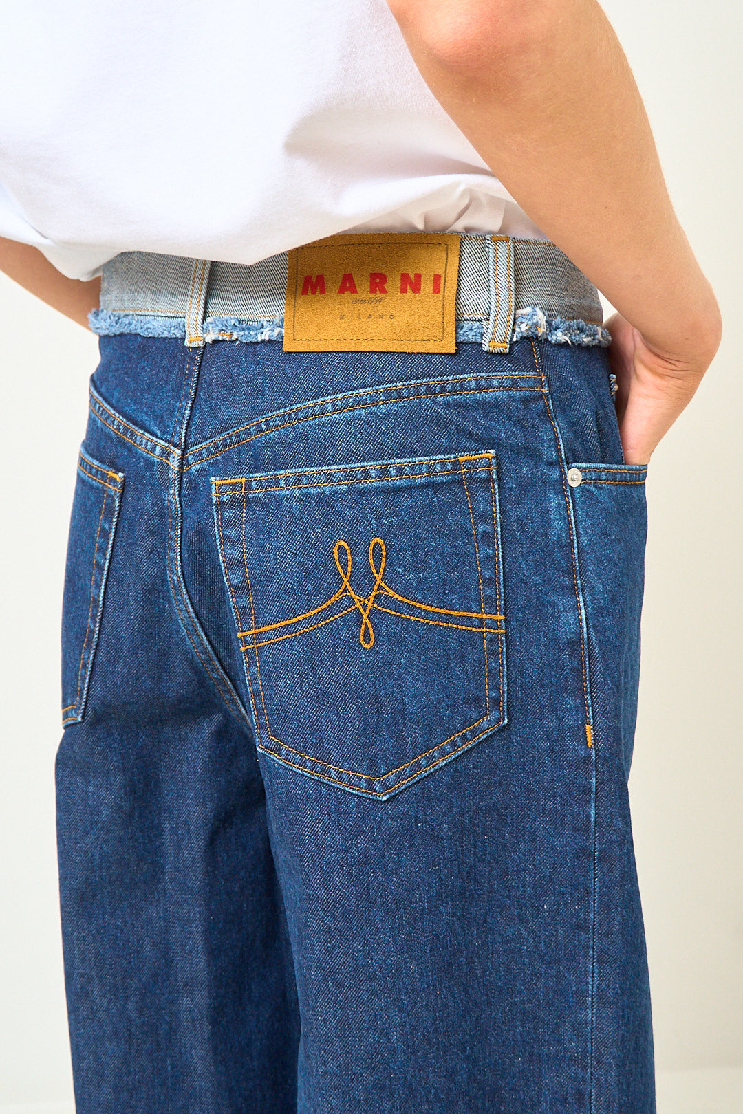 Blue Denim Inside-Out Jeans fra Marni. Disse jeans er fremstillet i bomulds denim. De er designet i en bred og lang pasform, med et sammensyet fold forneden. Disse bukser har en trevlet linning, sidelommer og to baglommer med detaljeret syninger .