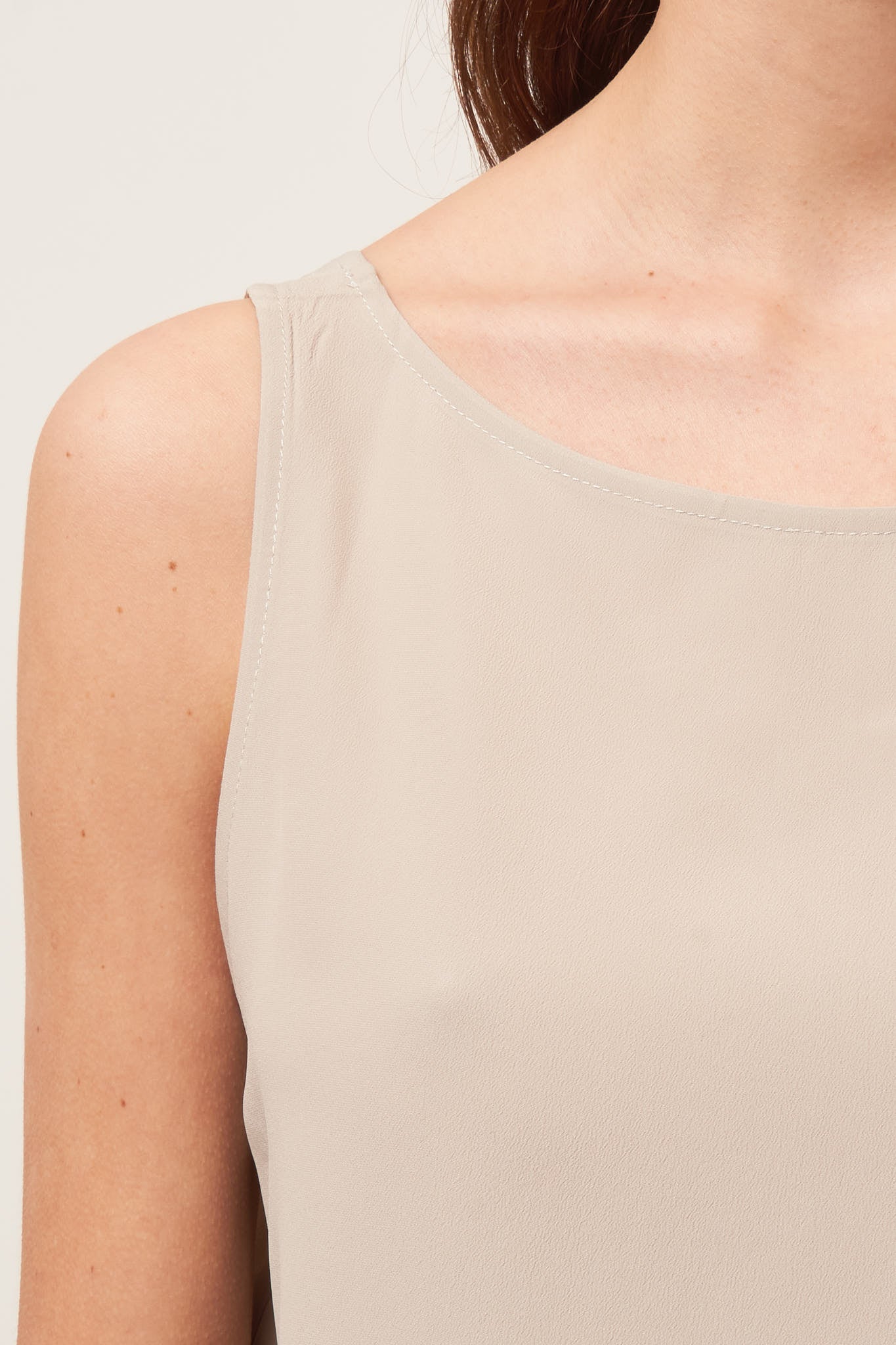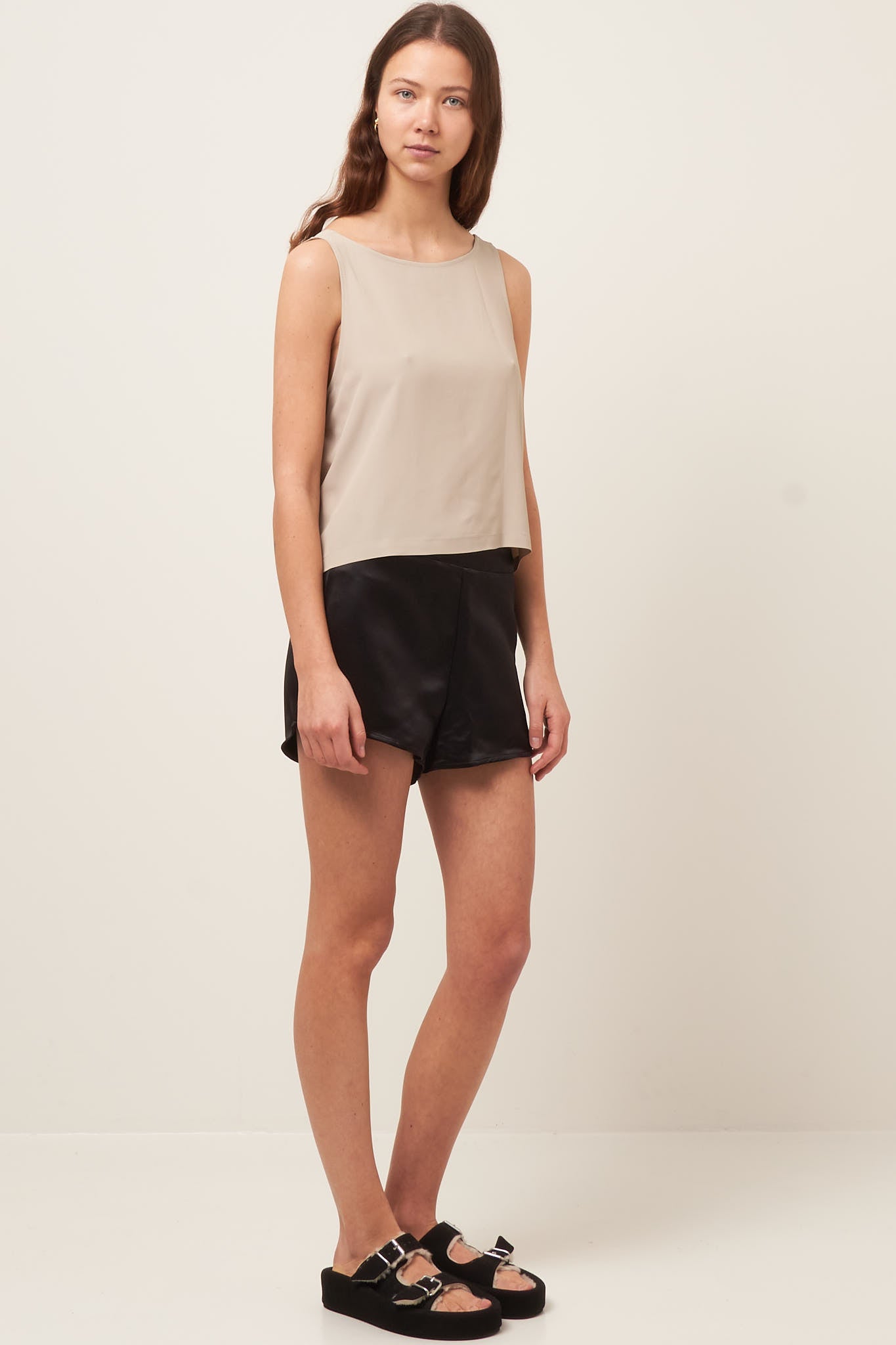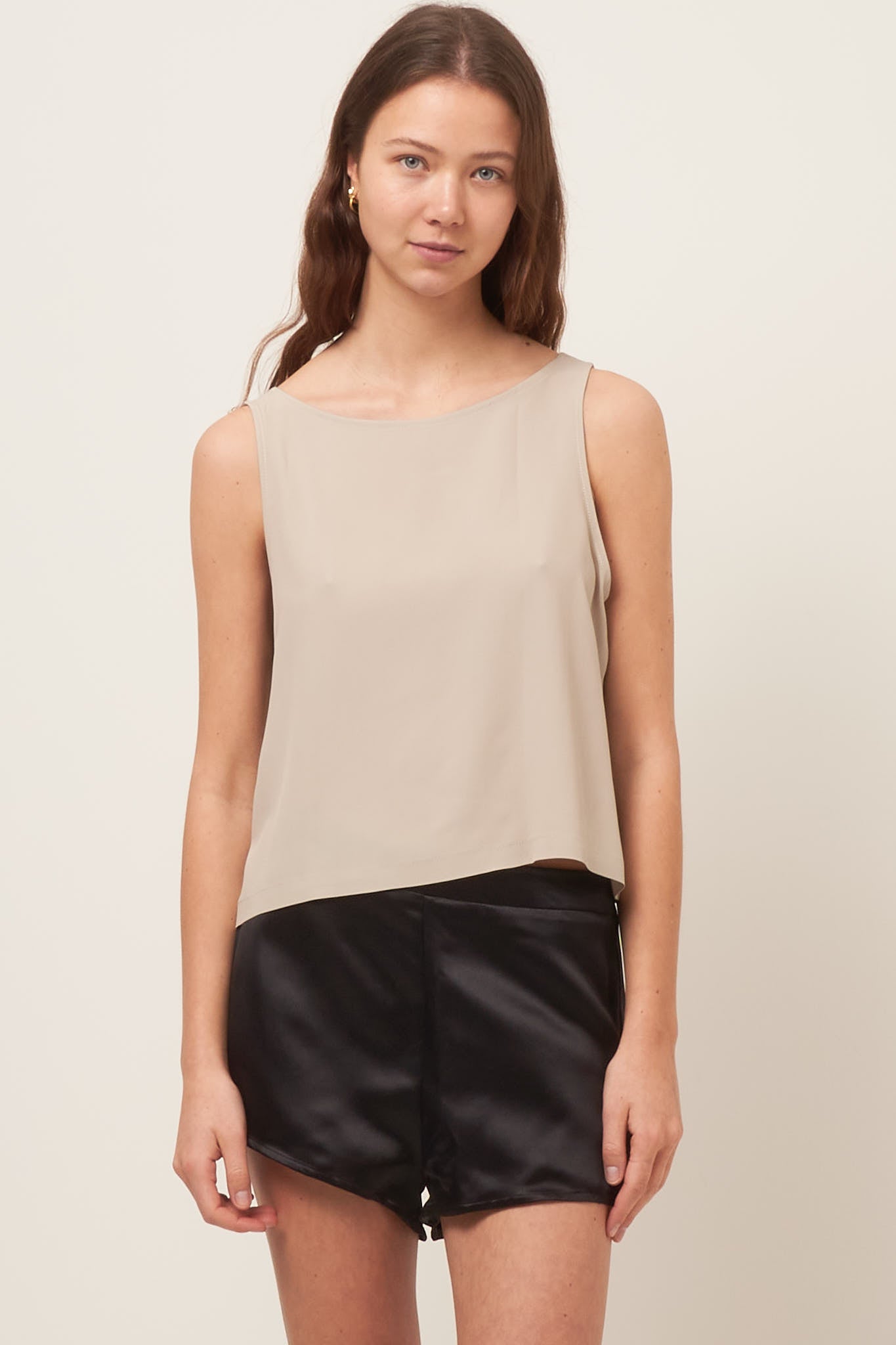 Alba Top Sand fra STRØM. Denne top er produceret i Italien og fremstillet i en glat silkeblanding. Den er designet i en afslappet pasform og er vendbar. Den har en dyb rund hals, brede stropper og har en semi-kort længde.
