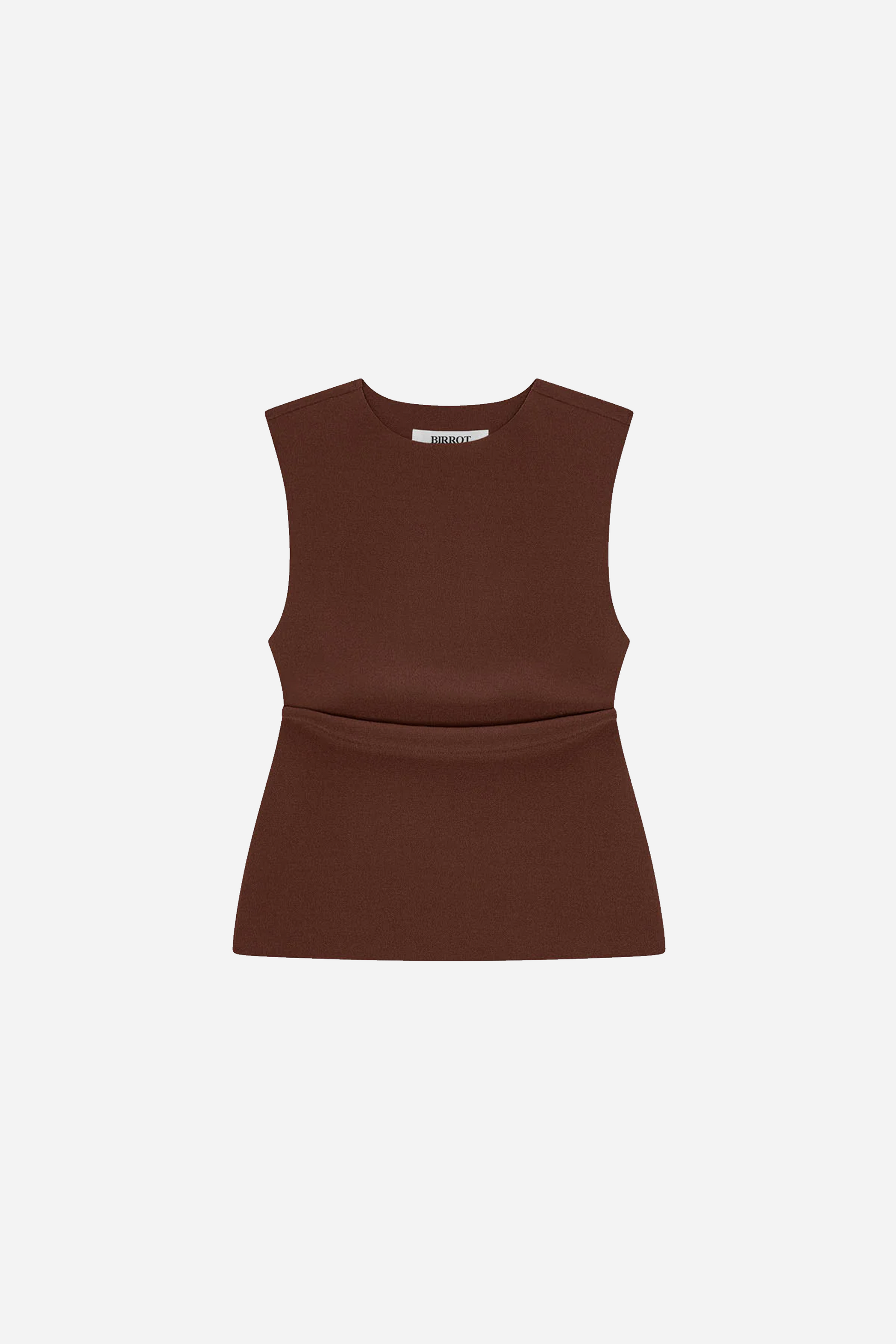 Lay2 Drape Top Brick fra BIRROT. Denne top er fremstillet i en kraftig polyesterblanding. Den er designet tætsiddende draperet pasform, brede skulderstropper, og en rund halsudskæring.