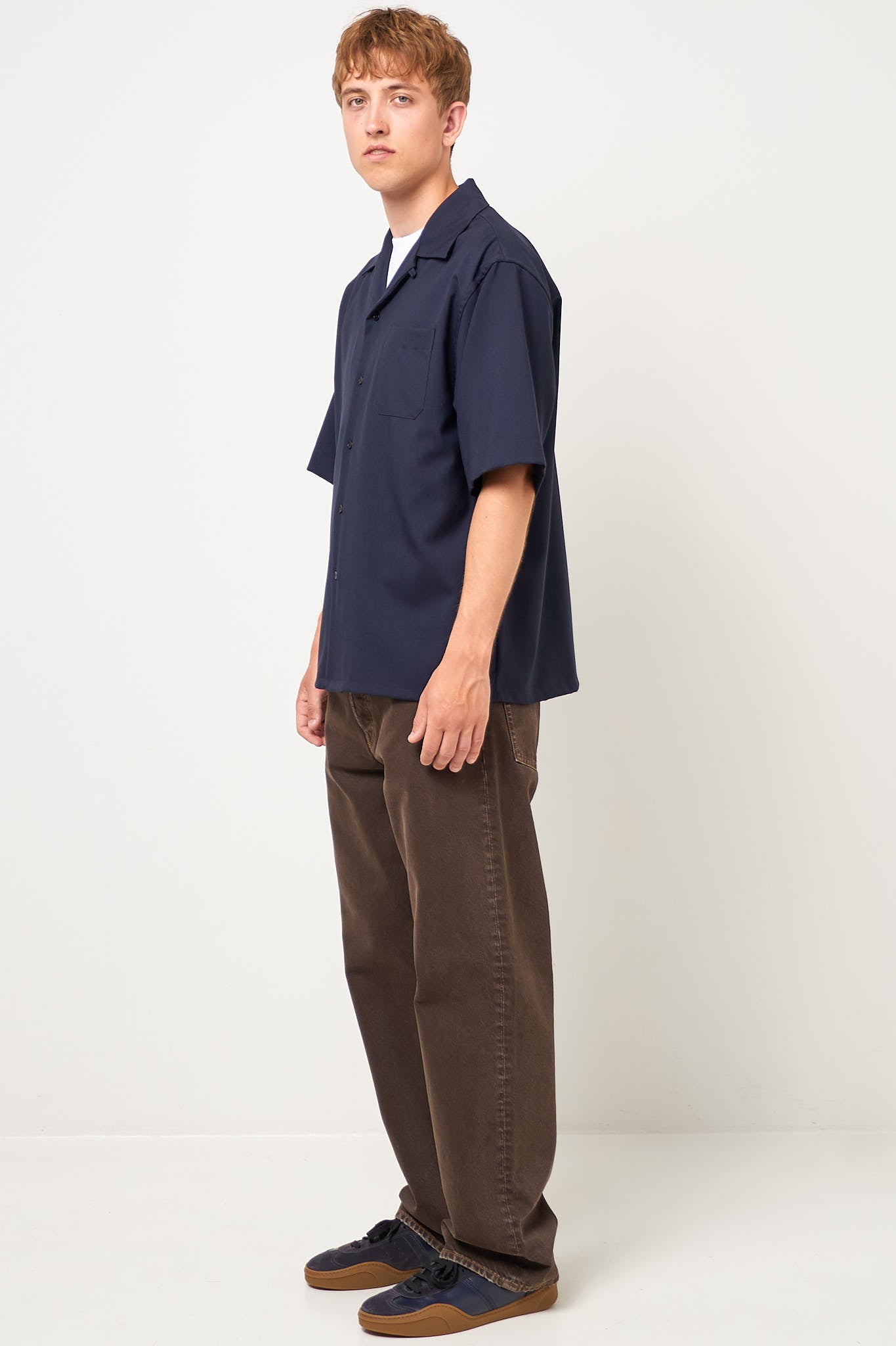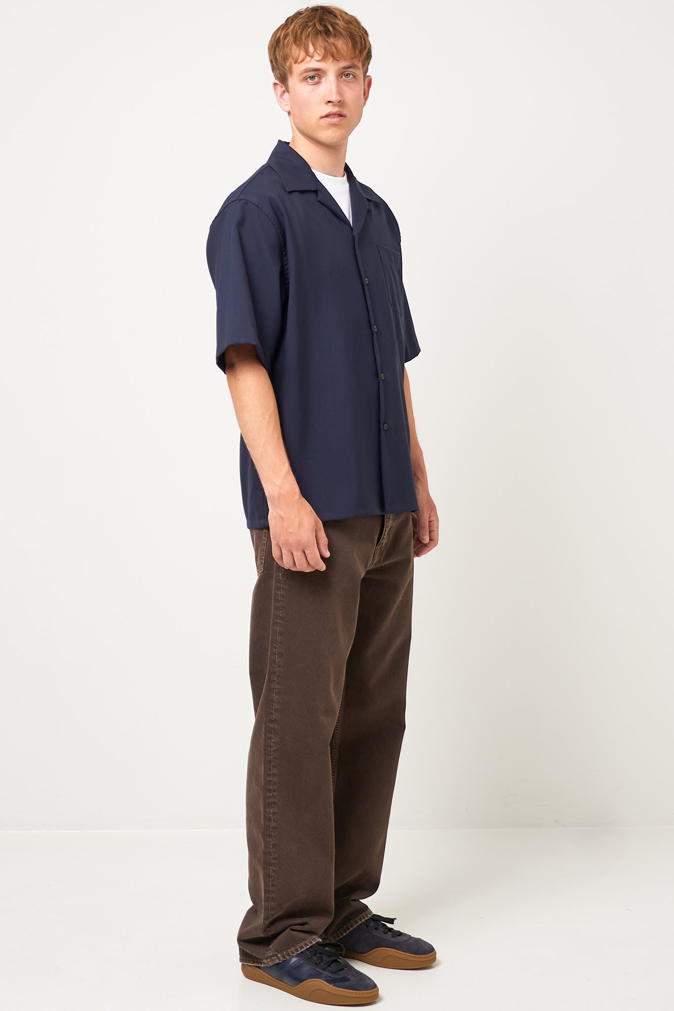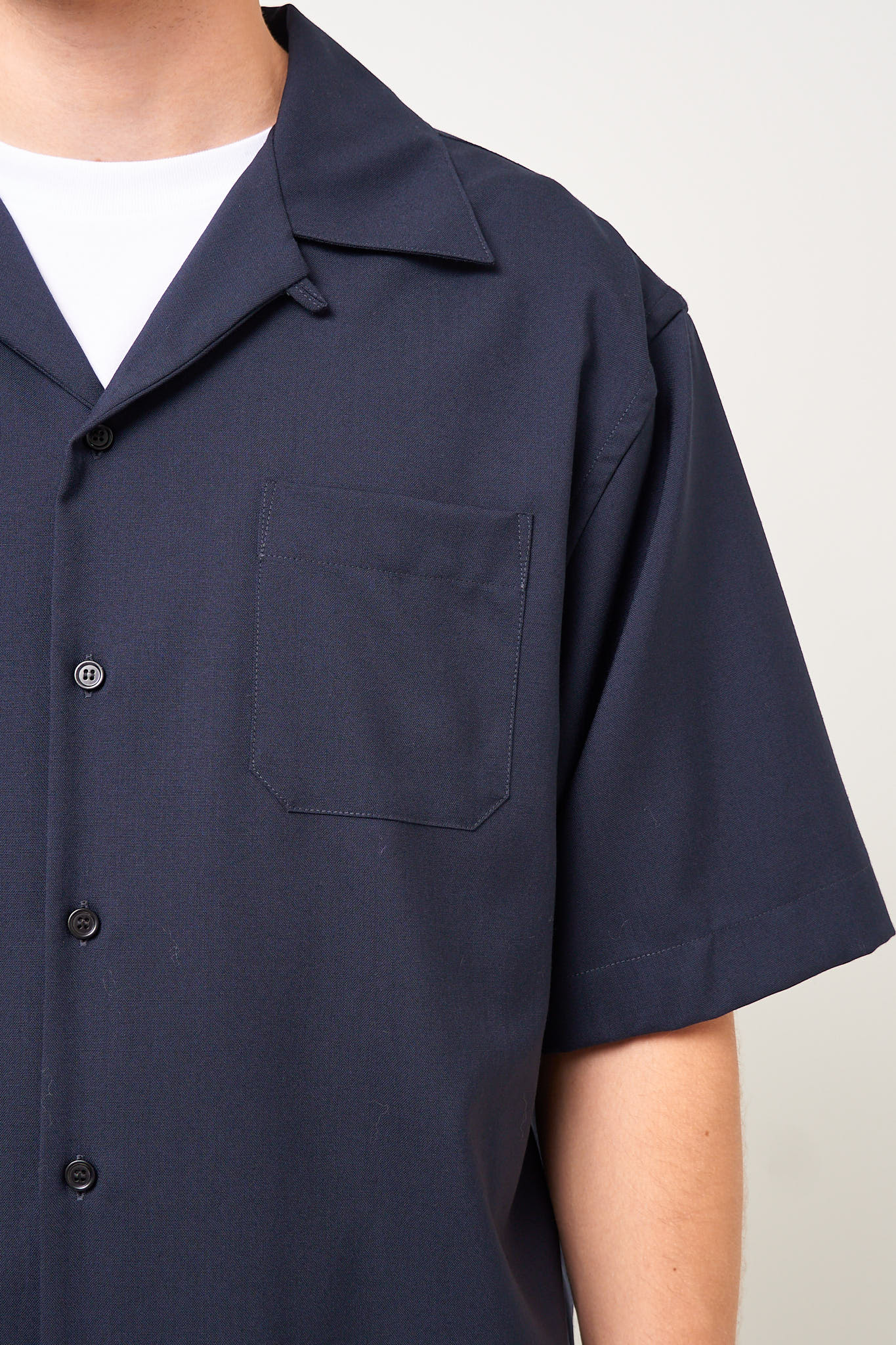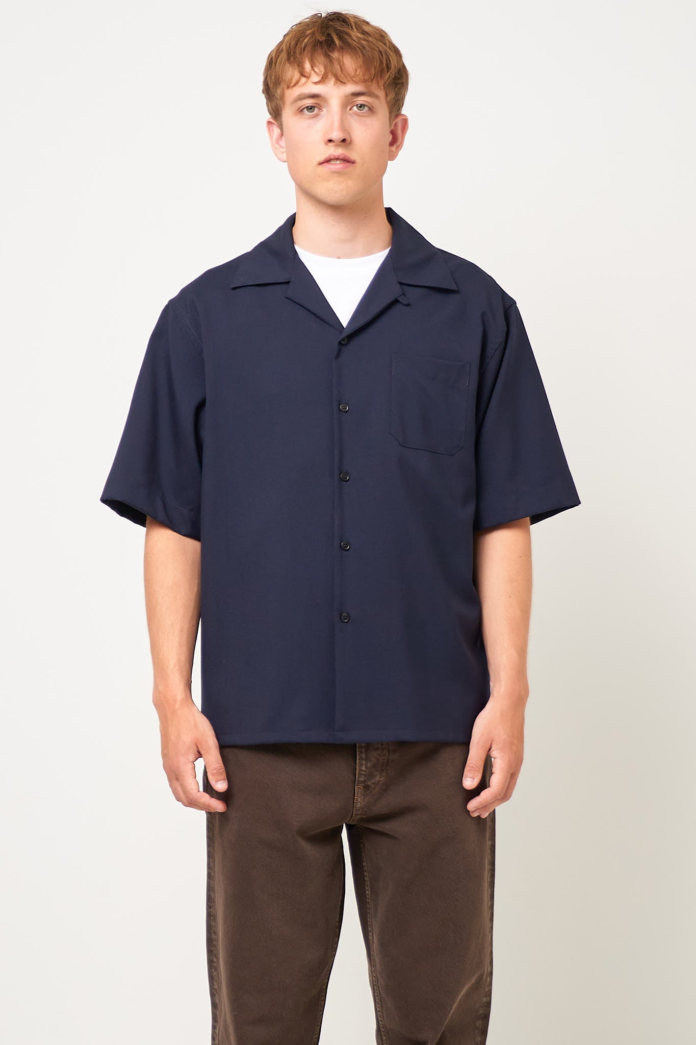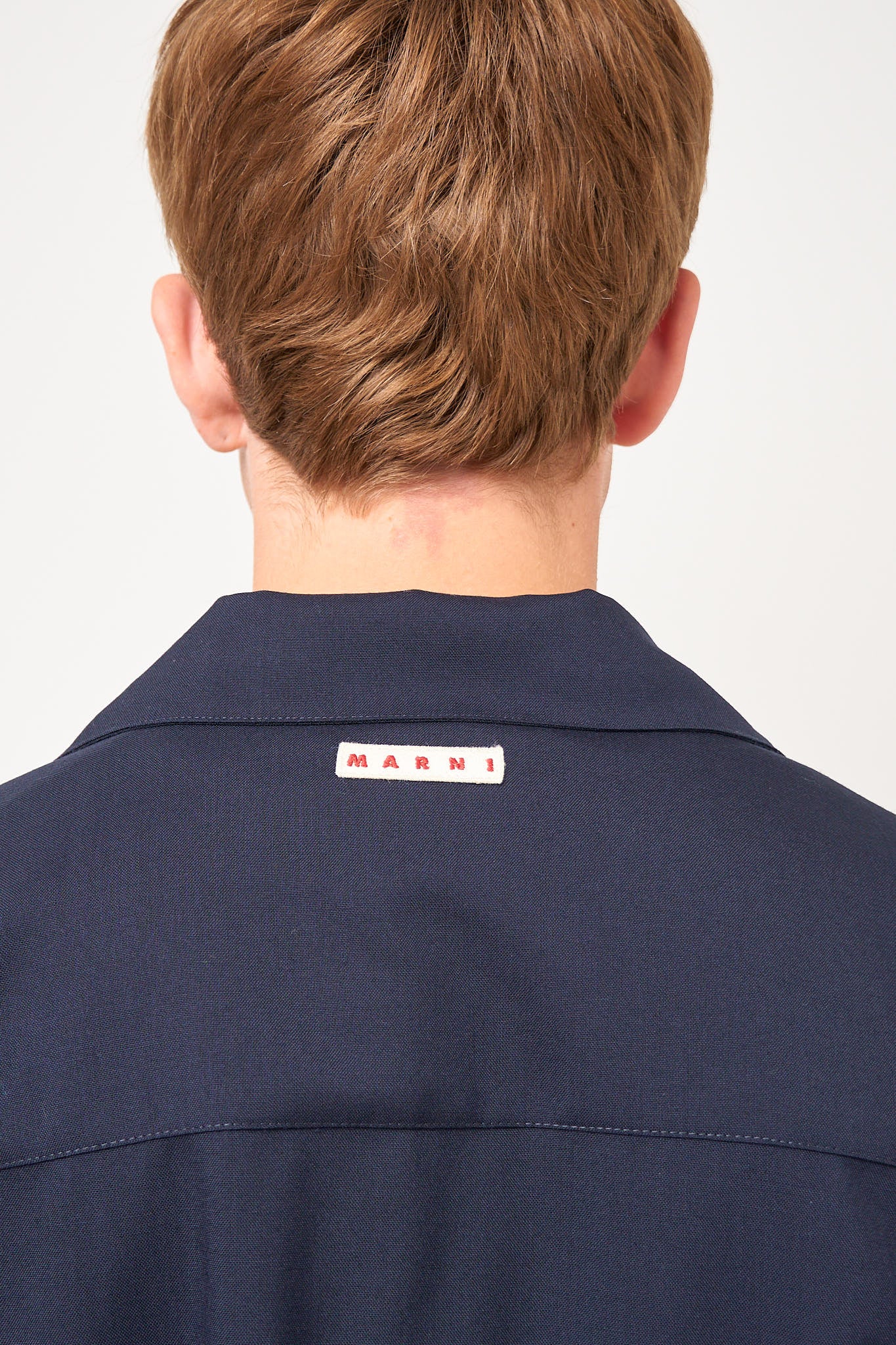 Bowling Shirt Tropical Wool Blue Black fra Marni. Denne skjorte er fremstillet i fin uld. Den er designet med en løs pasform, korte ærmer og en brystlomme på venstre side. Skjorten har et Marni logo bagpå.