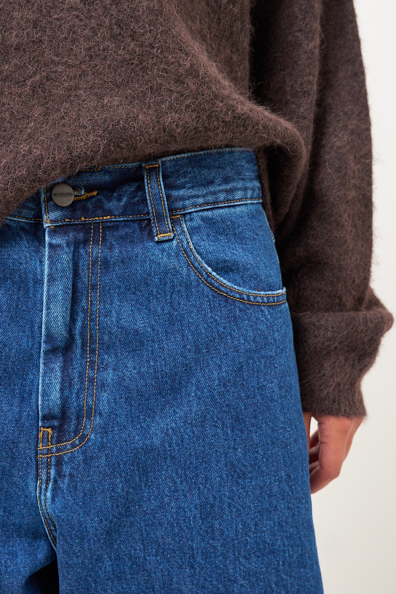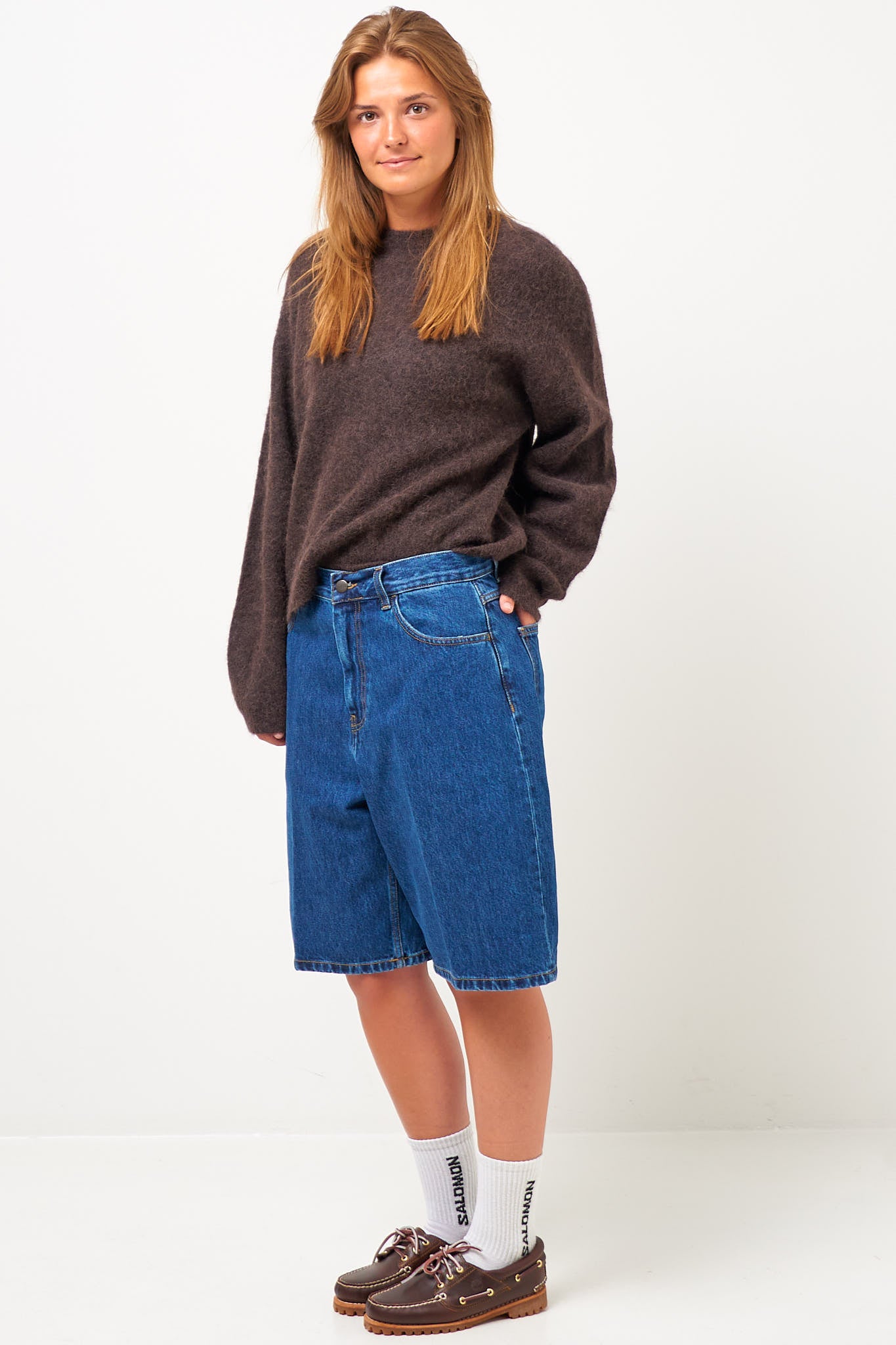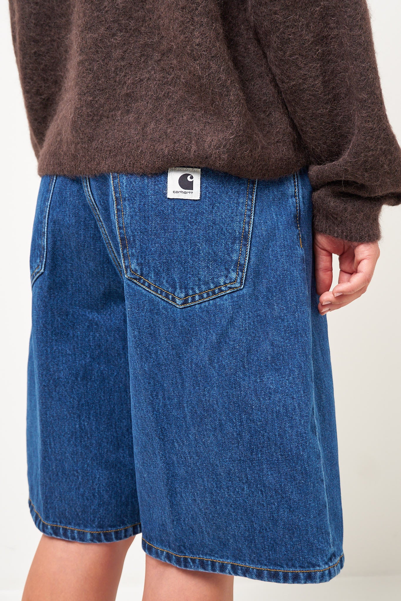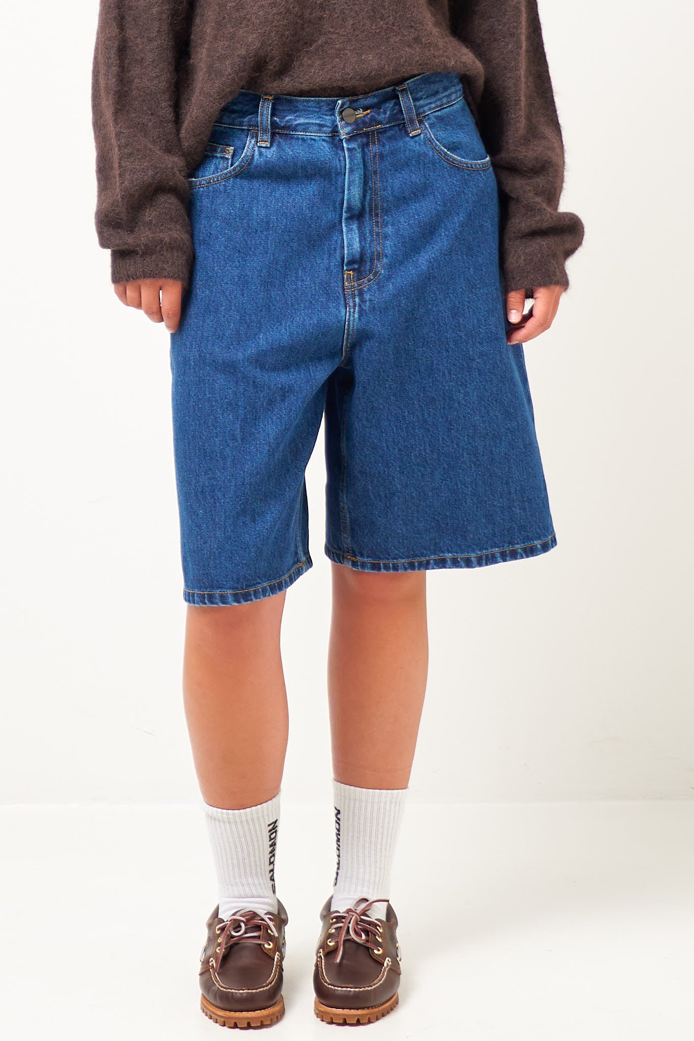 W' Brandon Shorts Blue Rinsed fra Carhartt WIP. Disse shorts er fremstillet i en kraftig bomuld. De har en afslappet pasform med brede ben, pressefolder, og et Carhartt WIP logo på baglommen.