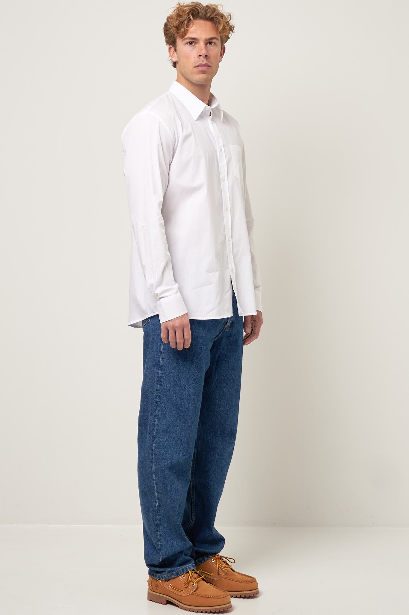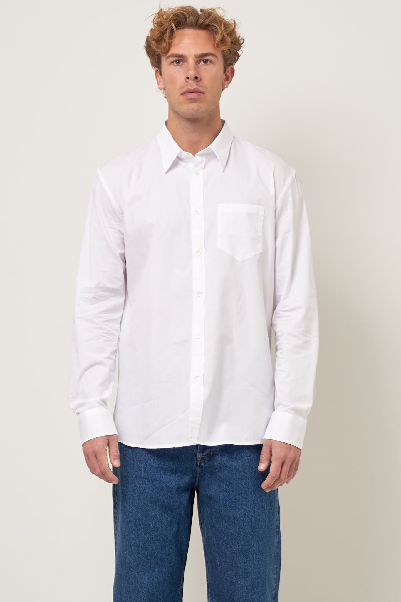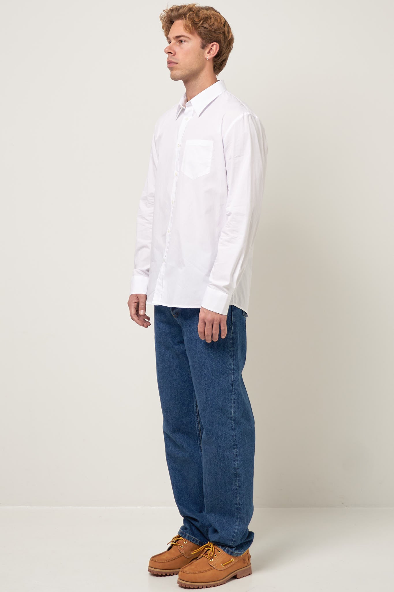 Brook Shirt Solid White fra STRØM. Denne skjorte har en almindelig pasform. Den er fremstillet i økologisk bomuld og er designet med en klassisk skjortekrave, manchetter med knapper, og en enkelt brystlomme i venstre side. Skjorten har en synlig knaplukning med knapper i perlemor.