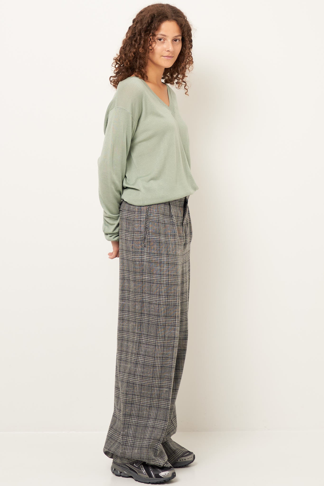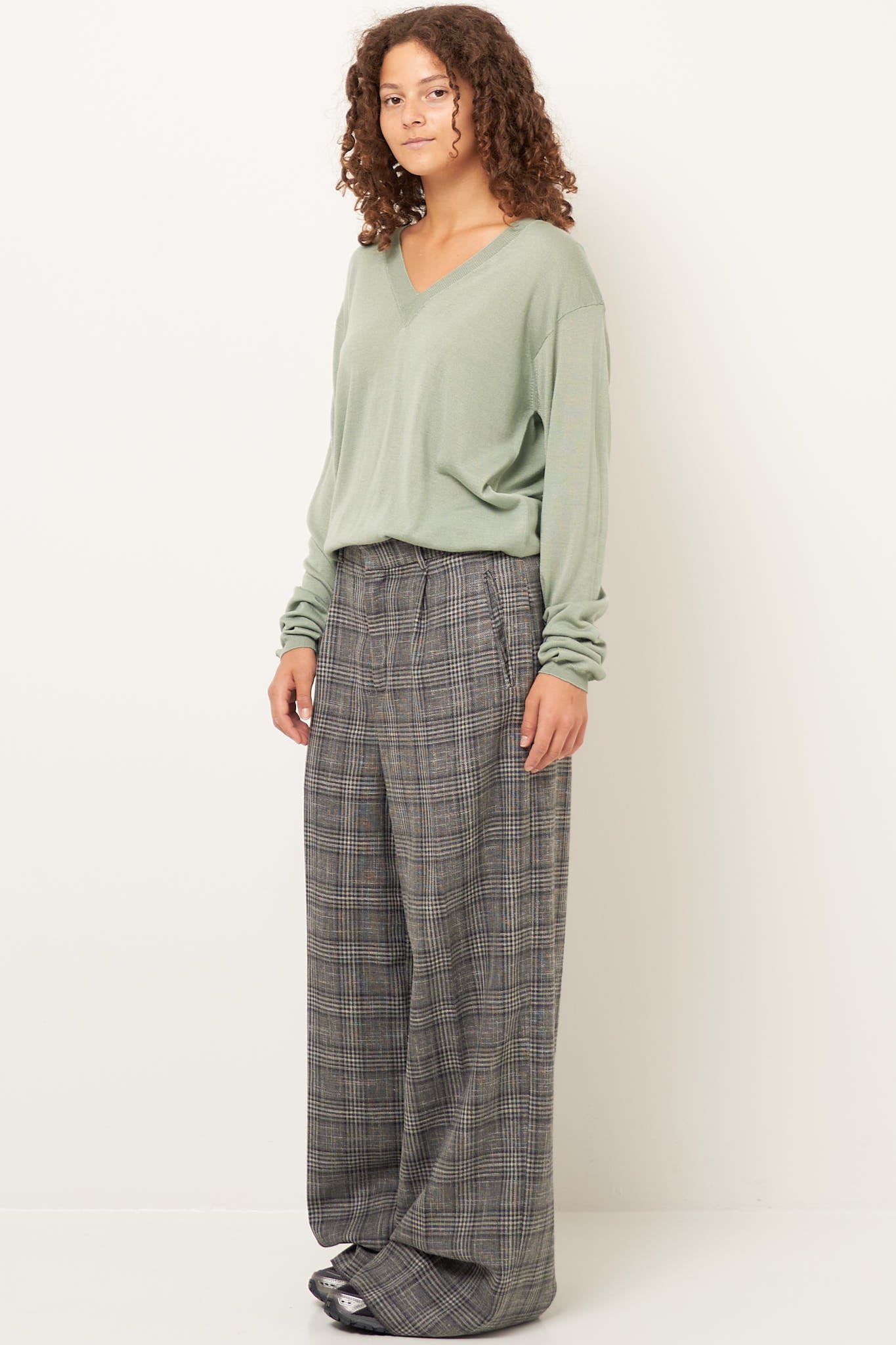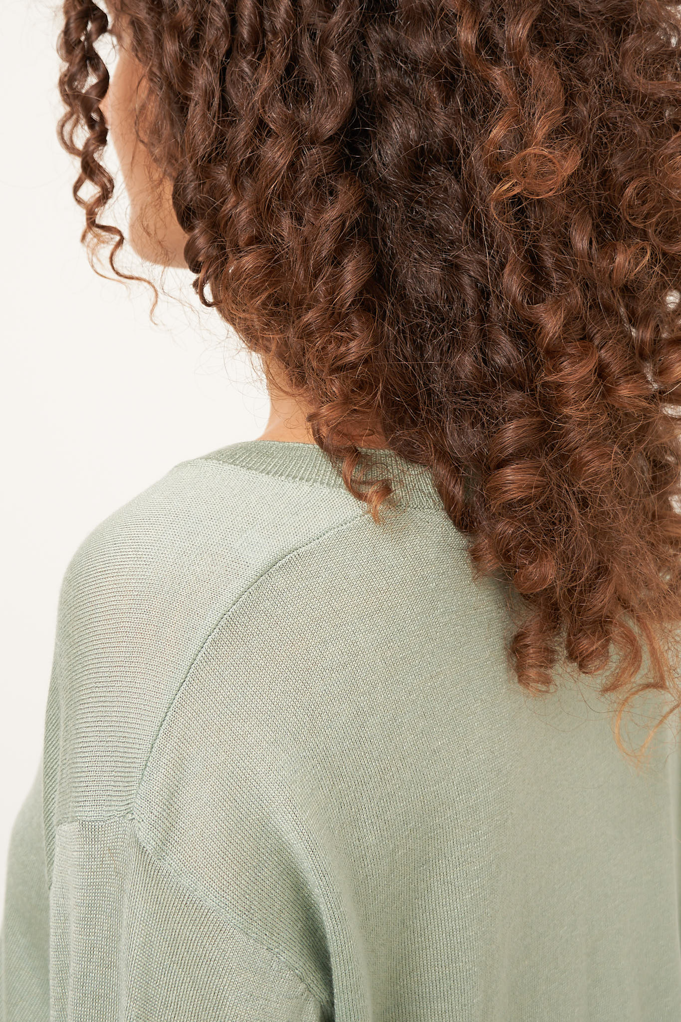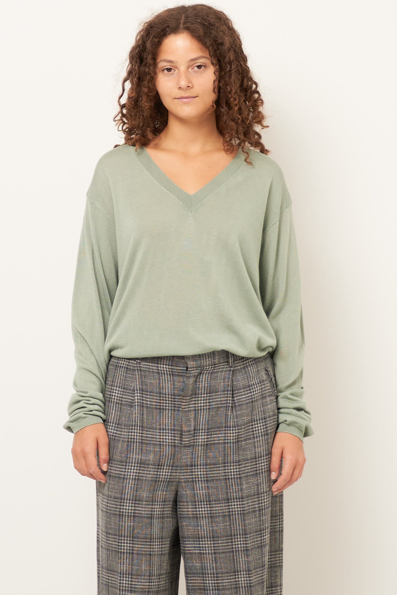 Ebba Wool Silk V-Neck Pale Green fra STRØM. Denne strik er fremstillet i en slike og merinould blanding. Den har en normal pasform med v-halsudskæring og ribkanter. Strikken er fremstillet i Italien.