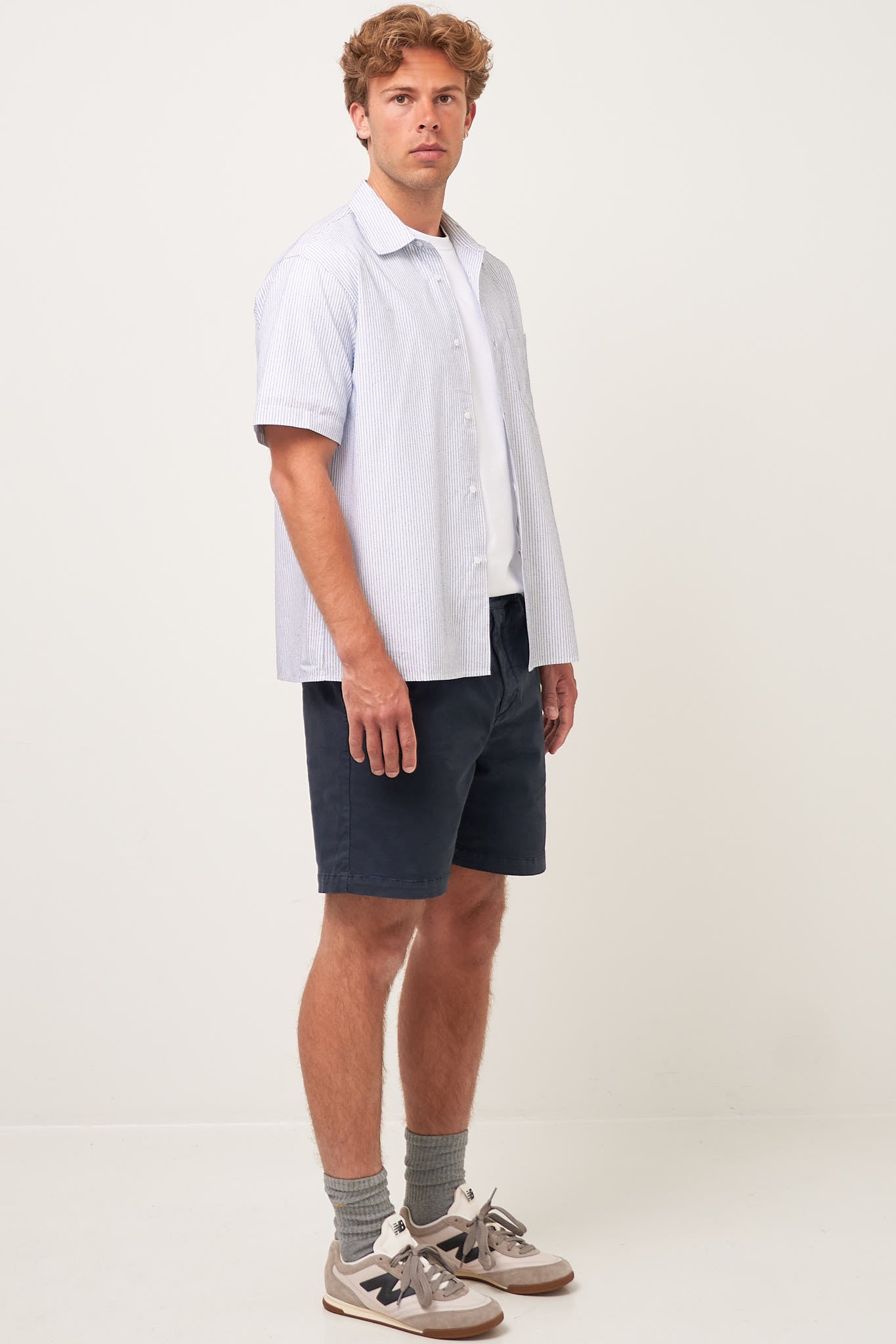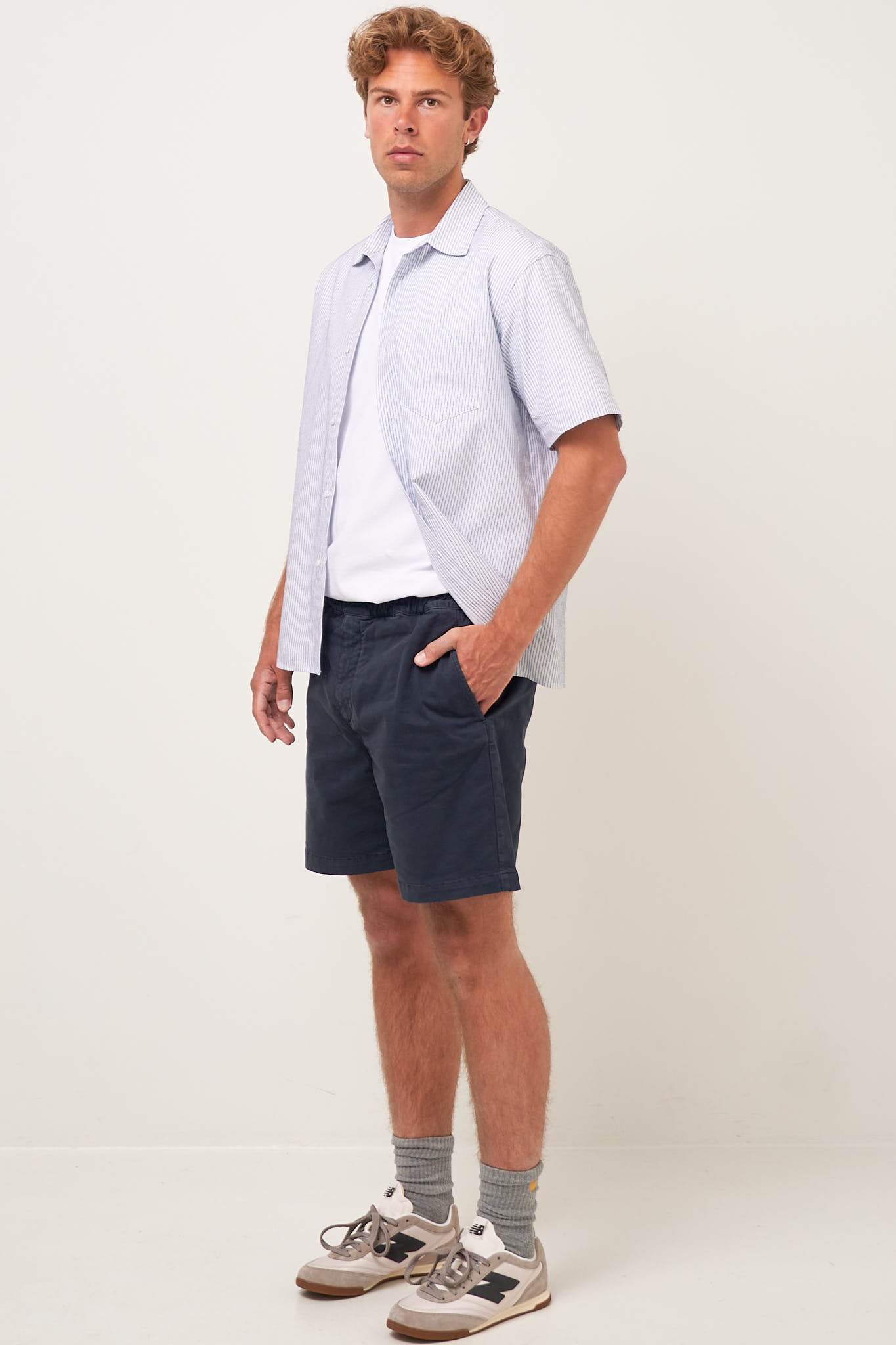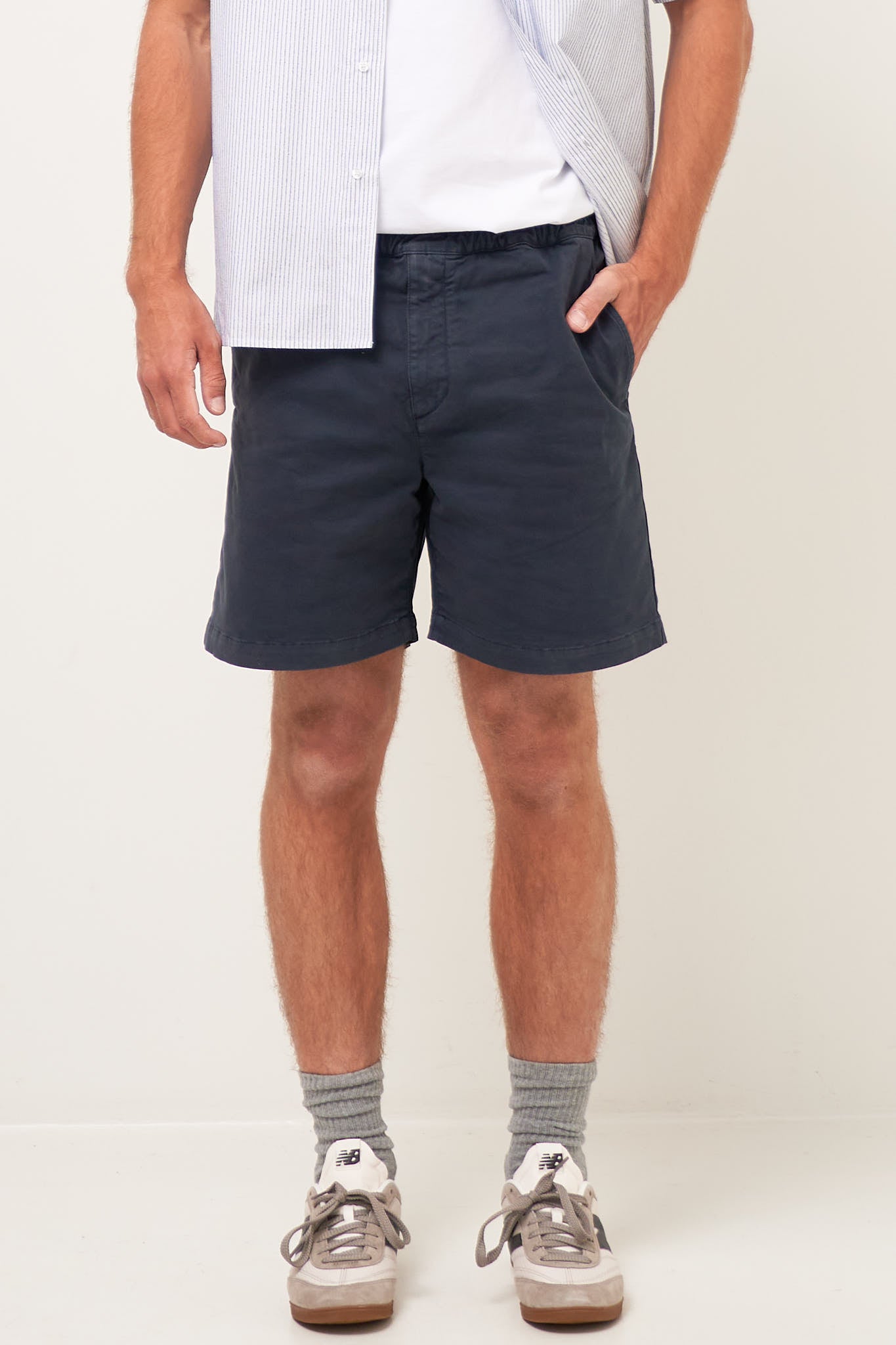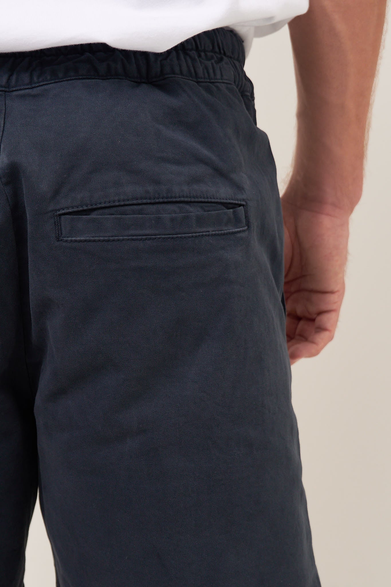 Field Shorts Navy fra STRØM. Disse shorts er fremstillet i en genanvendt bomuldsblanding. De er designet i et regular fit med lommer foran og bagpå. De har elastik og lynlås i livet. Disse shorts er fremstillet i Portugal.