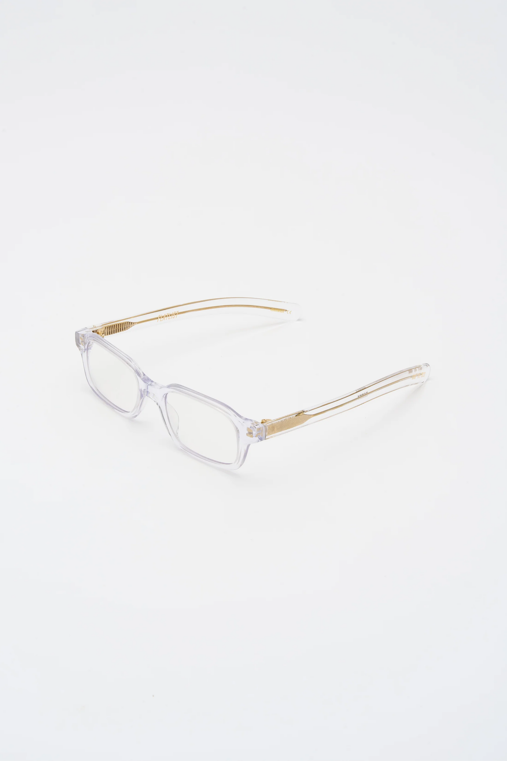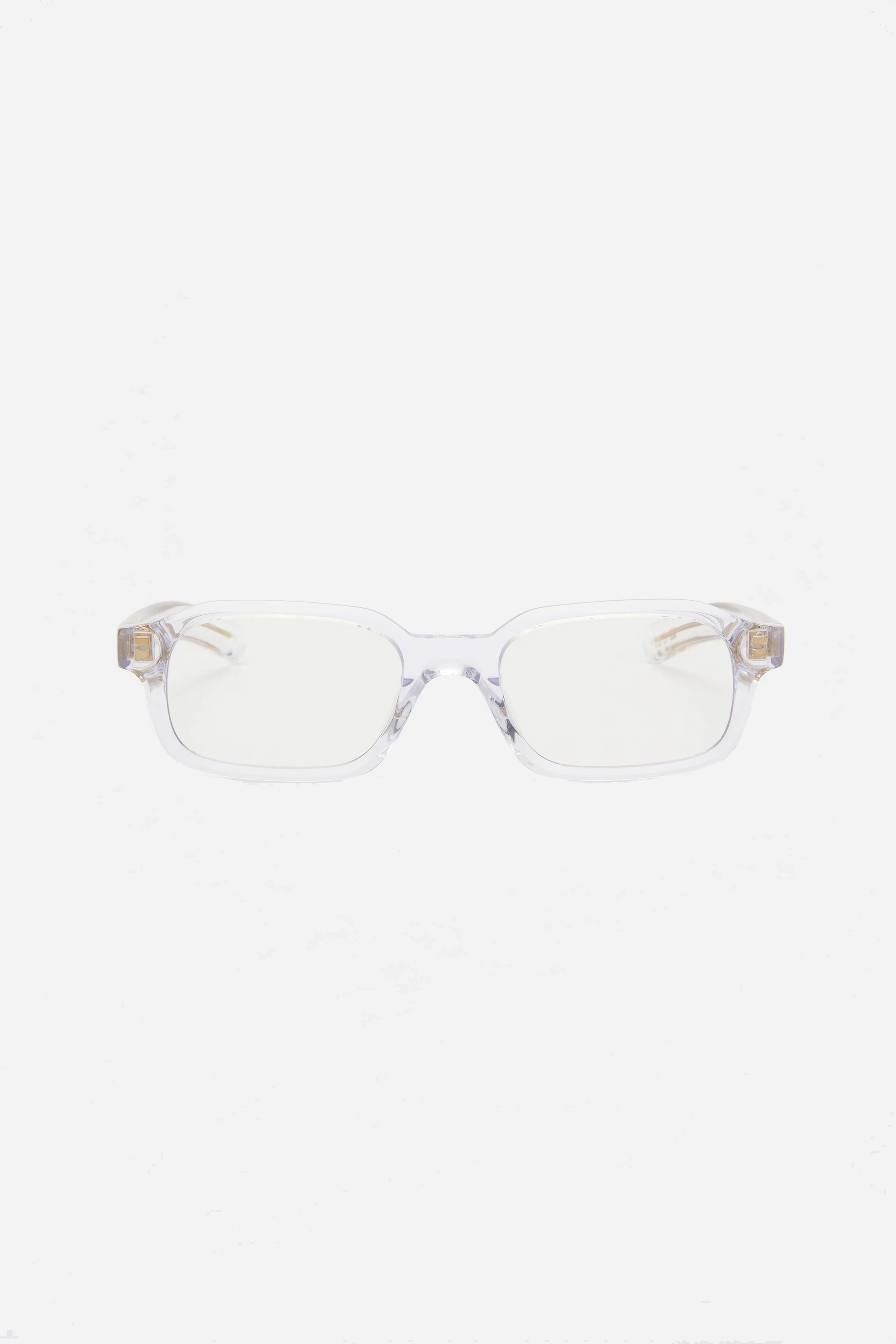 Hanky Clear Crystal/Clear Blue Light Lens fra Flatlist Eyewear. Brillerne er fremstillet i håndlavet acetat. De har ridsefrit glas med 100% UVA/UVB beskyttelse og leveres i en æske med etui og mikrofiberklud.
