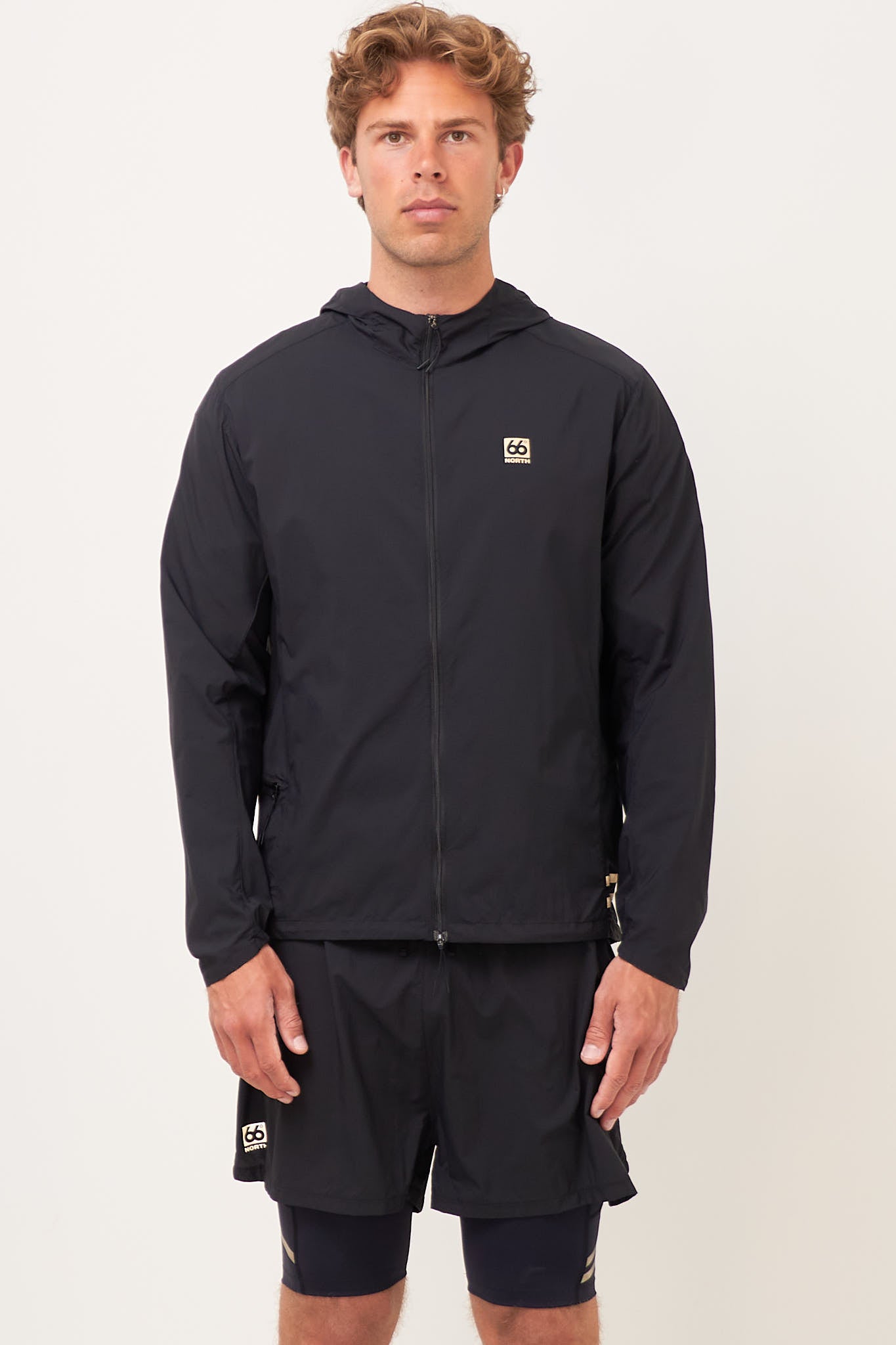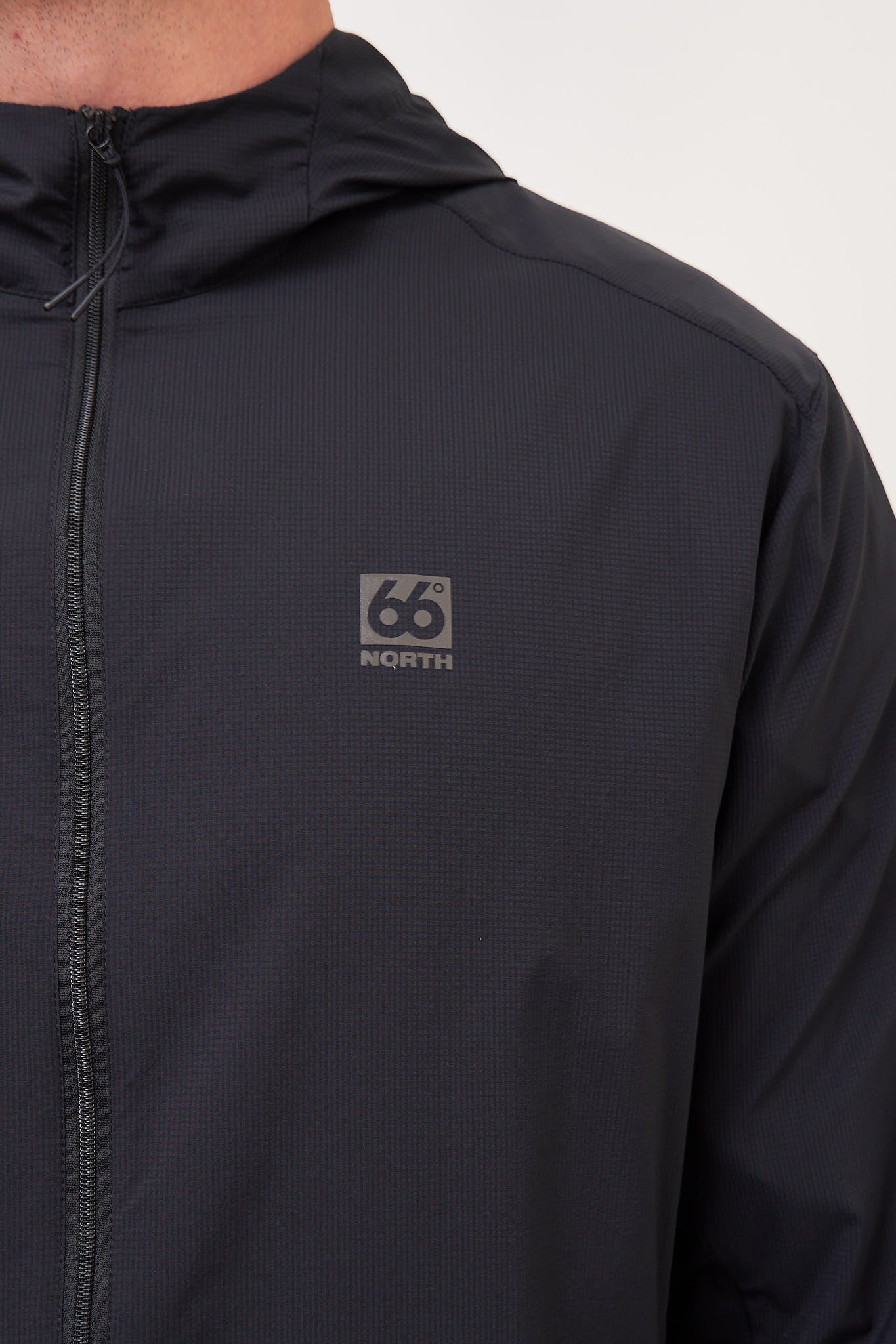 Helgafell Jacket Black fra 66°North. Denne jakke er fremstillet i en let polyamidblanding. Den har en normal og afslappet pasform med lommer i siden, reflekser og et 66°North logo på brystet. Jakken lukkes med lynlås.