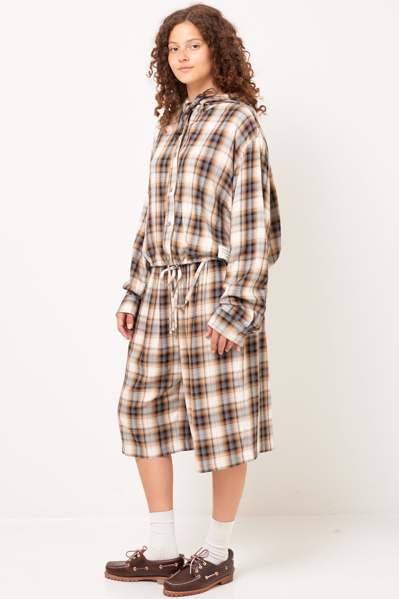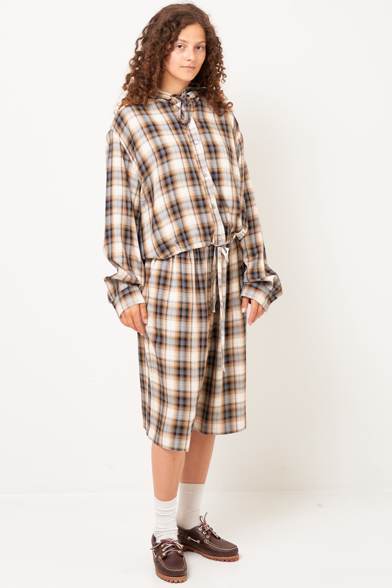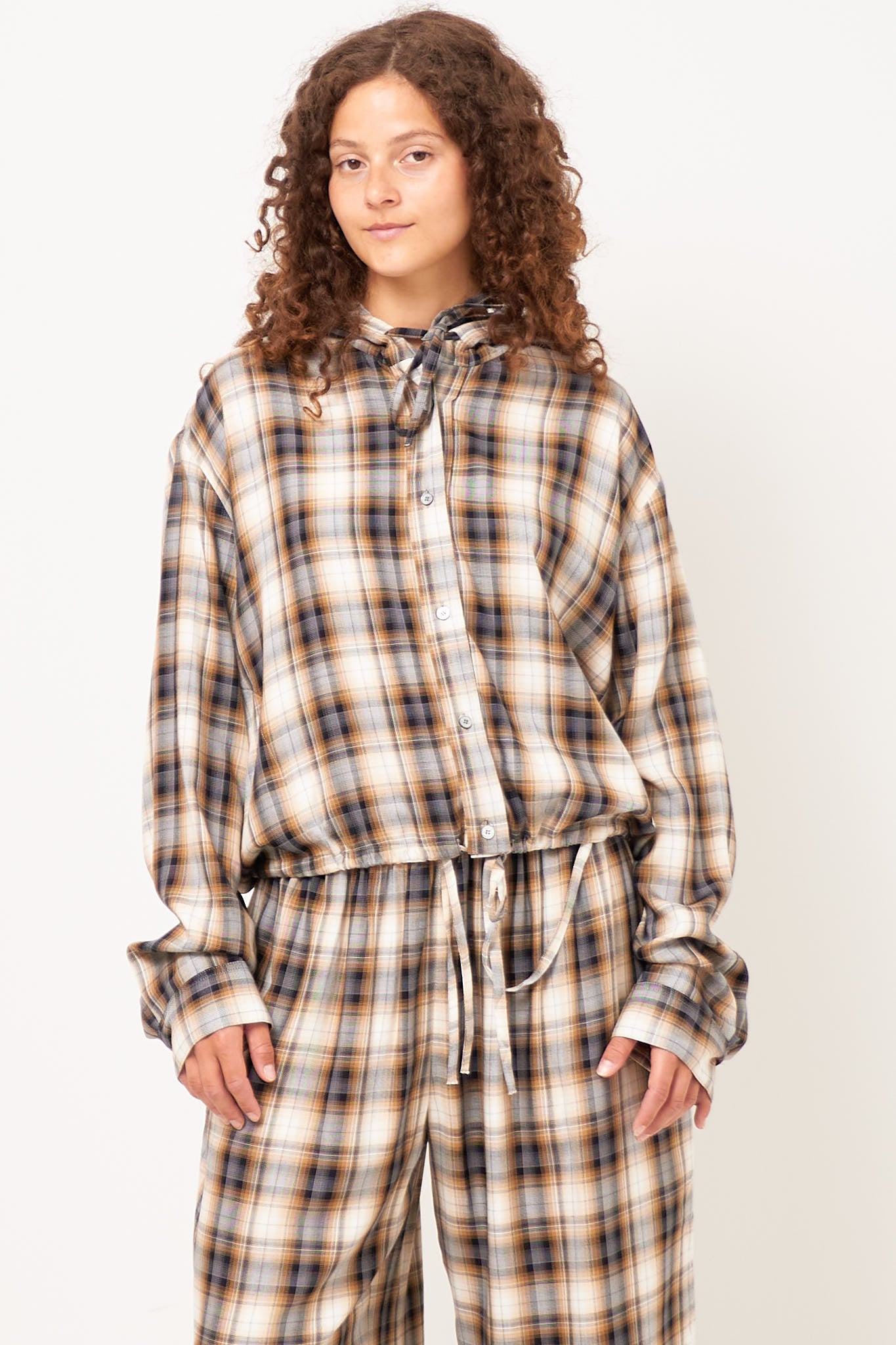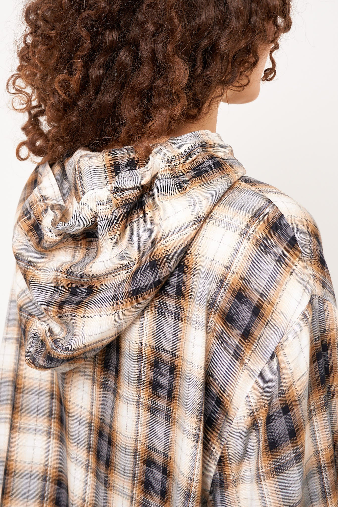 Hooded Overshirt Beige Black Check fra Acne Studios. Denne skjorte er fremstillet i en bæredygtig og let viskose. Den har en afslappet pasform med snøre i toppen og bunden. Skjorten har en hætte og et Acne Studios logo på siden. Den lukkes med knapper.
