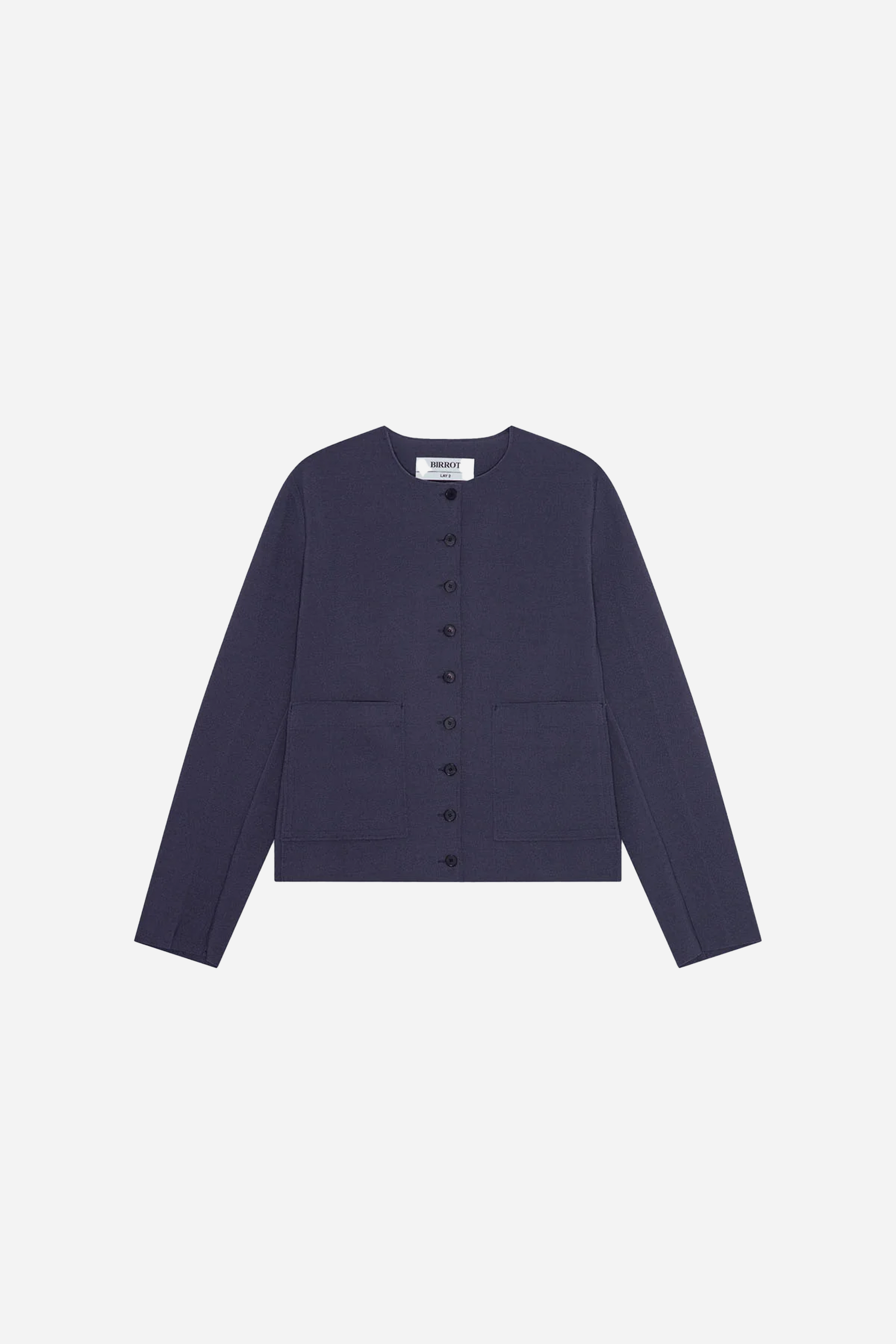 Lay2 Roundneck Jacket Mood Indigo fra BIRROT. Denne jakke er fremstillet i en kraftig polyesterblanding. Den er designet normal pasform, lange ærmer, rund halsudskæring, og slids bagtil. Jakken lukkes med knapper fortil.