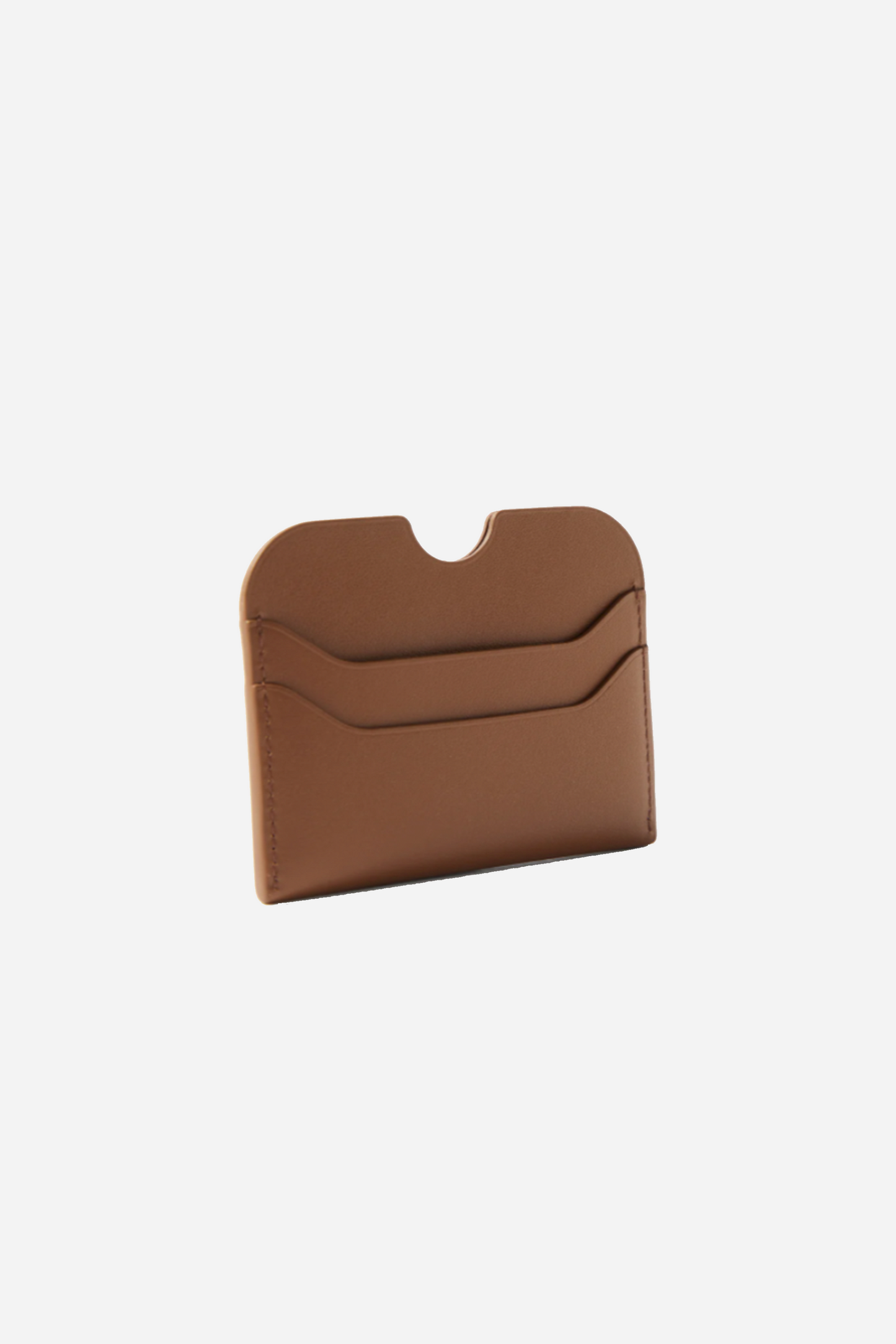 Leather Card Holder Camel Brown fra Acne Studios. Denne kortholder er fremstillet i blødt kernelæder med plads til minimum 5 kort og et sølvfarvet Acne Studios logo trykt på forsiden.