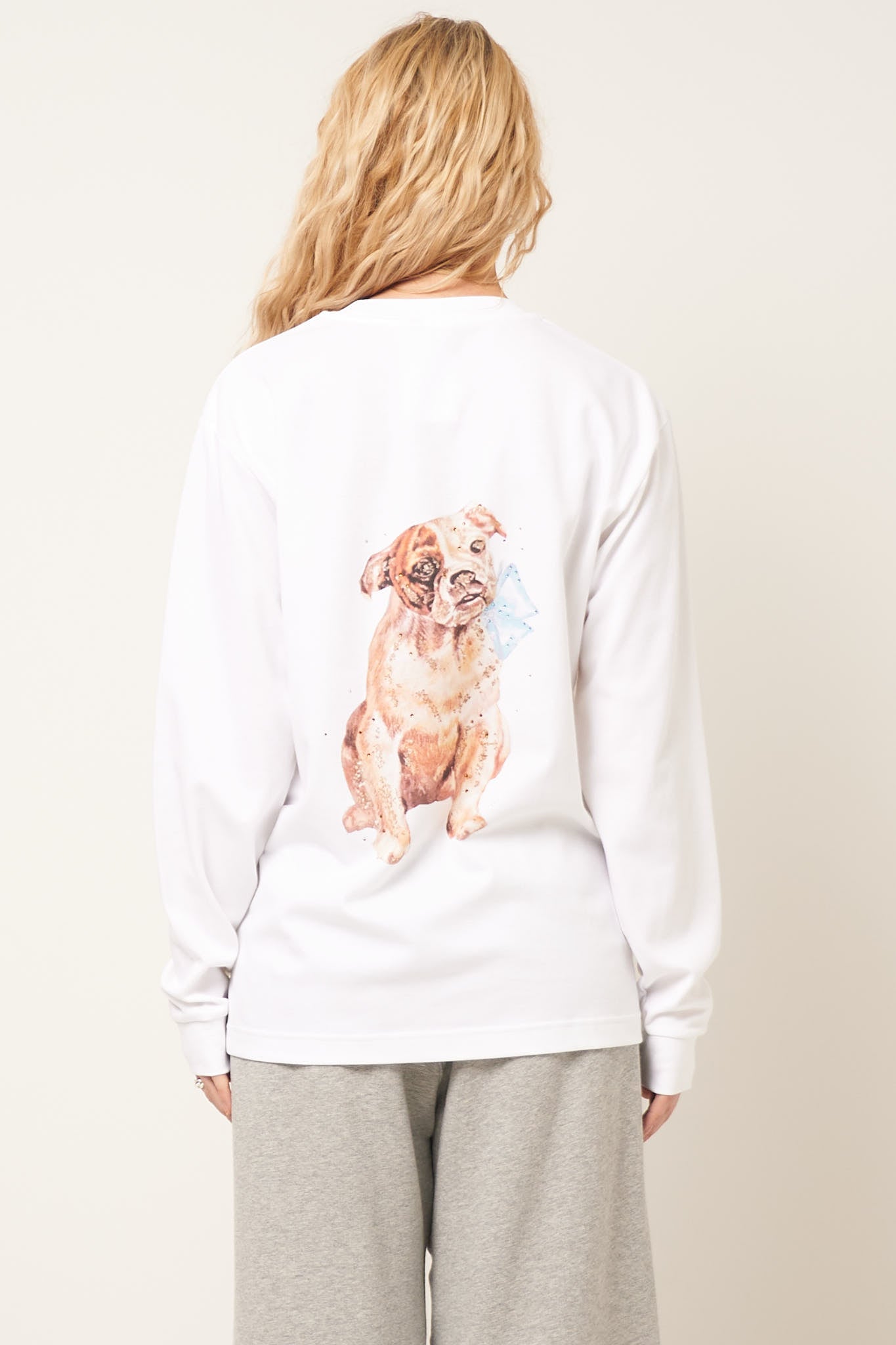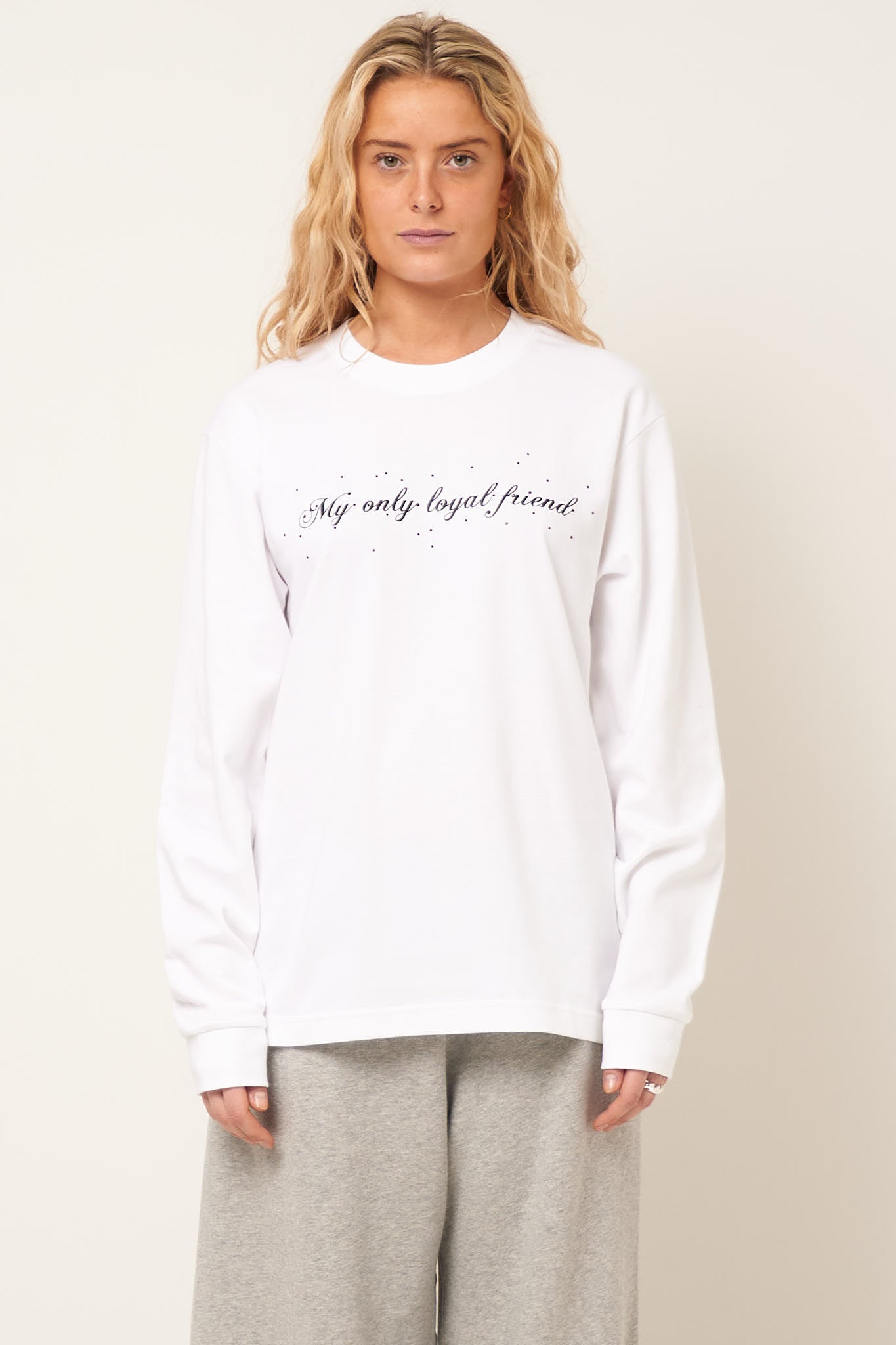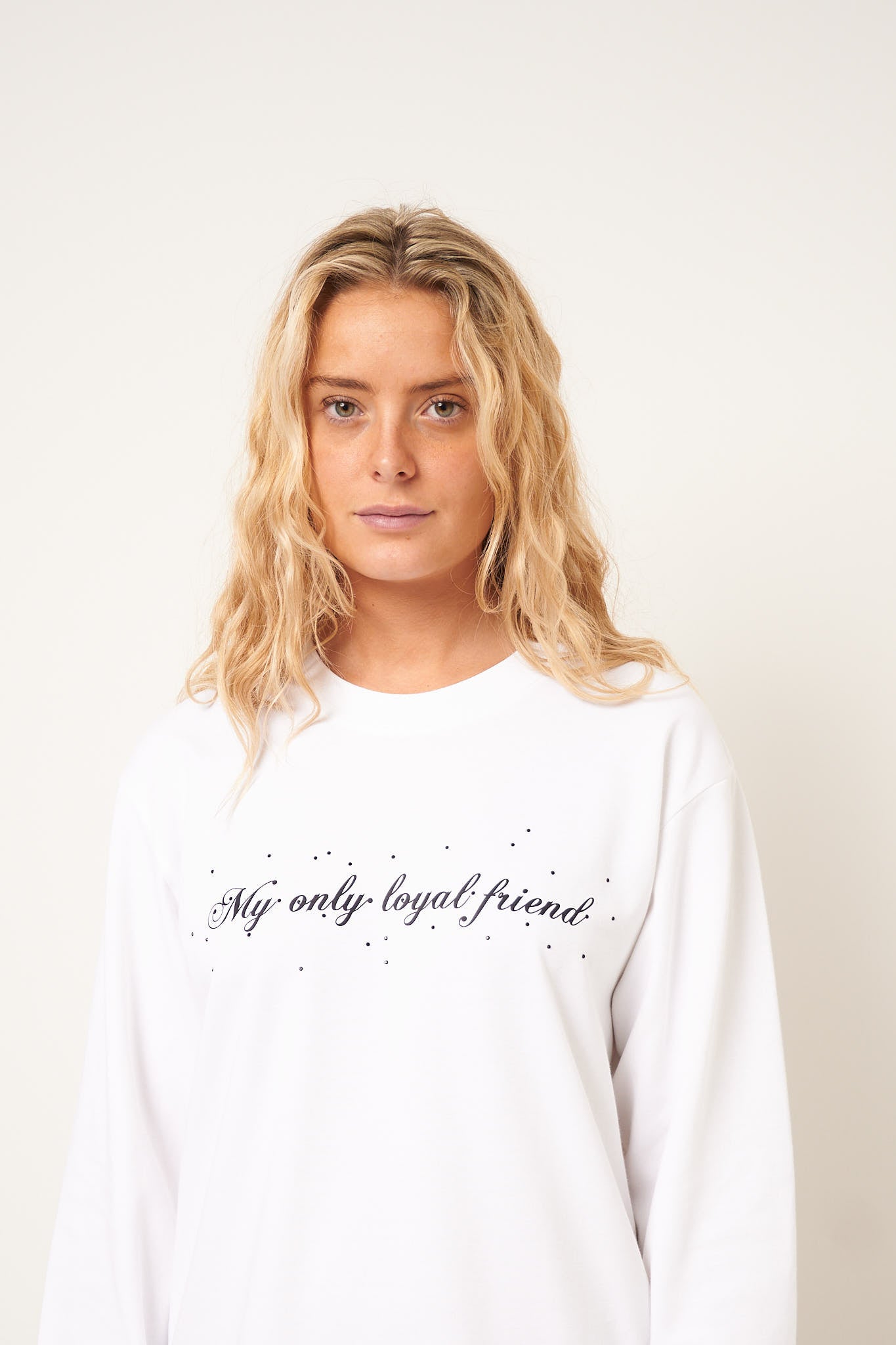 My Only Loyal Friend L/S T-Shirt White fra gabi gamél. Denne langærmede t-shirt er fremstillet i en blød bomuld. Den er designet i en oversized pasform med rund halsudskæring og ribkanter. T-shirten har et print fortil med tekst og et større print bagpå med Swarovski rhinsten.