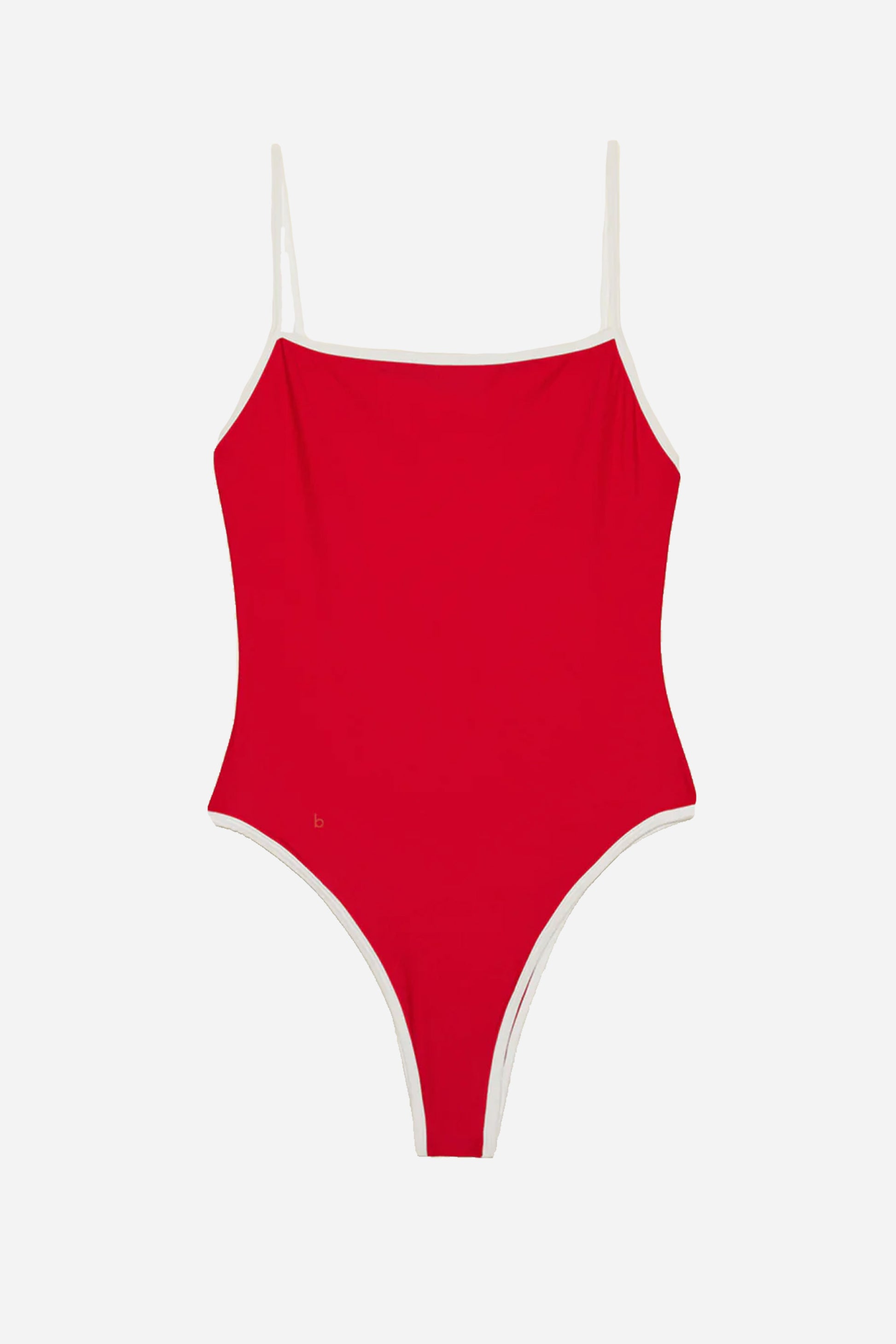 Neo Swimsuit Red/White fra Bare Stockholm. Denne badedragt er fremstillet i glat og åndbart ECONYL®. Materialet er ekstra modstandsdygtigt over for klor, solcreme og olie. Den har en tæt pasform med justerbare stropper og kontrastfarvede røde kanter langs sømmene. Badedragten er fuldt foret.