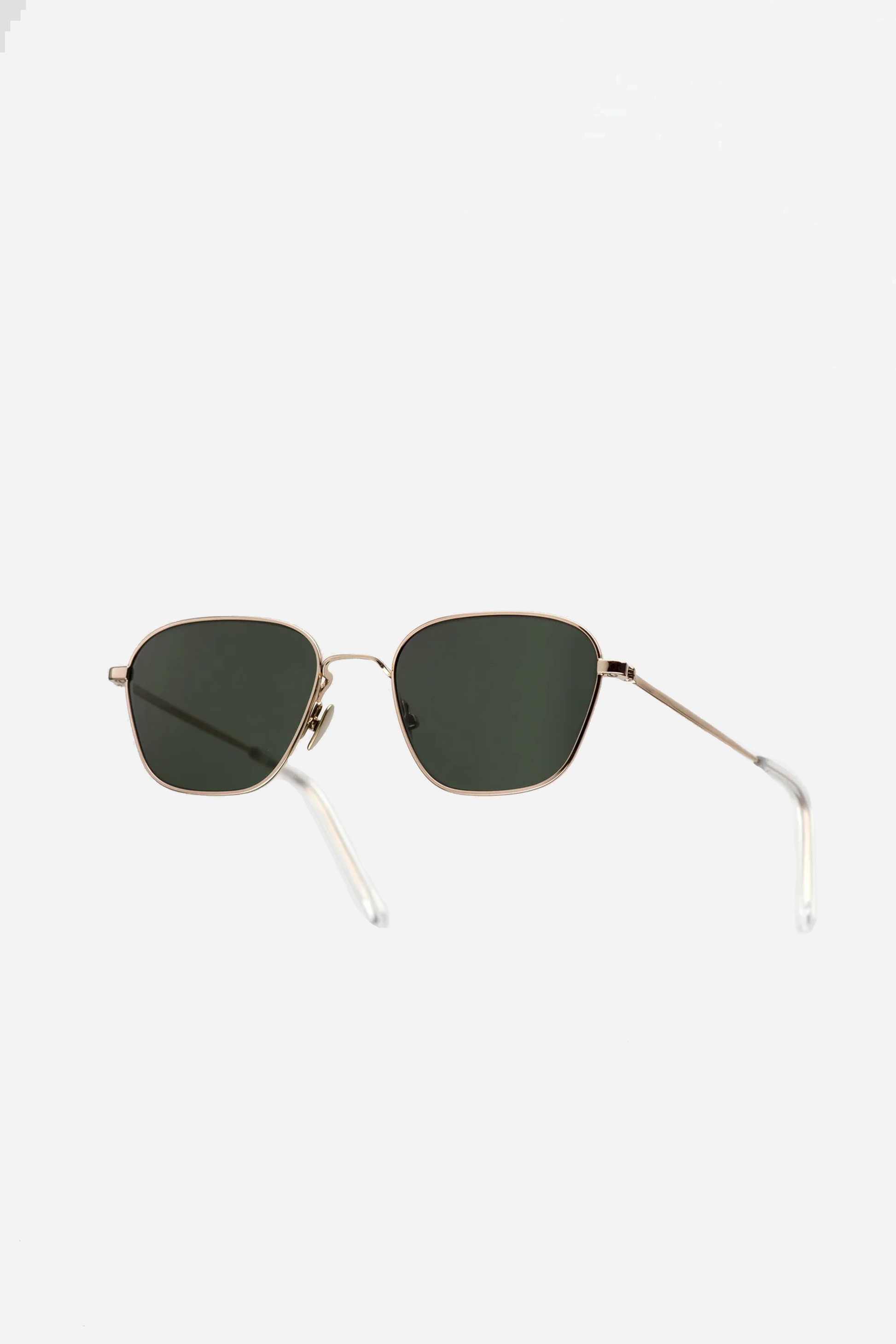 Otis Gold/Green Solid Lens fra Monokel Eyewear. Solbrillerne er fremstillet i rustfrit stål. De har ridsefri glas med 100% UVA/UVB beskyttelse og leveres i en æske med etui og mikrofiberklud.