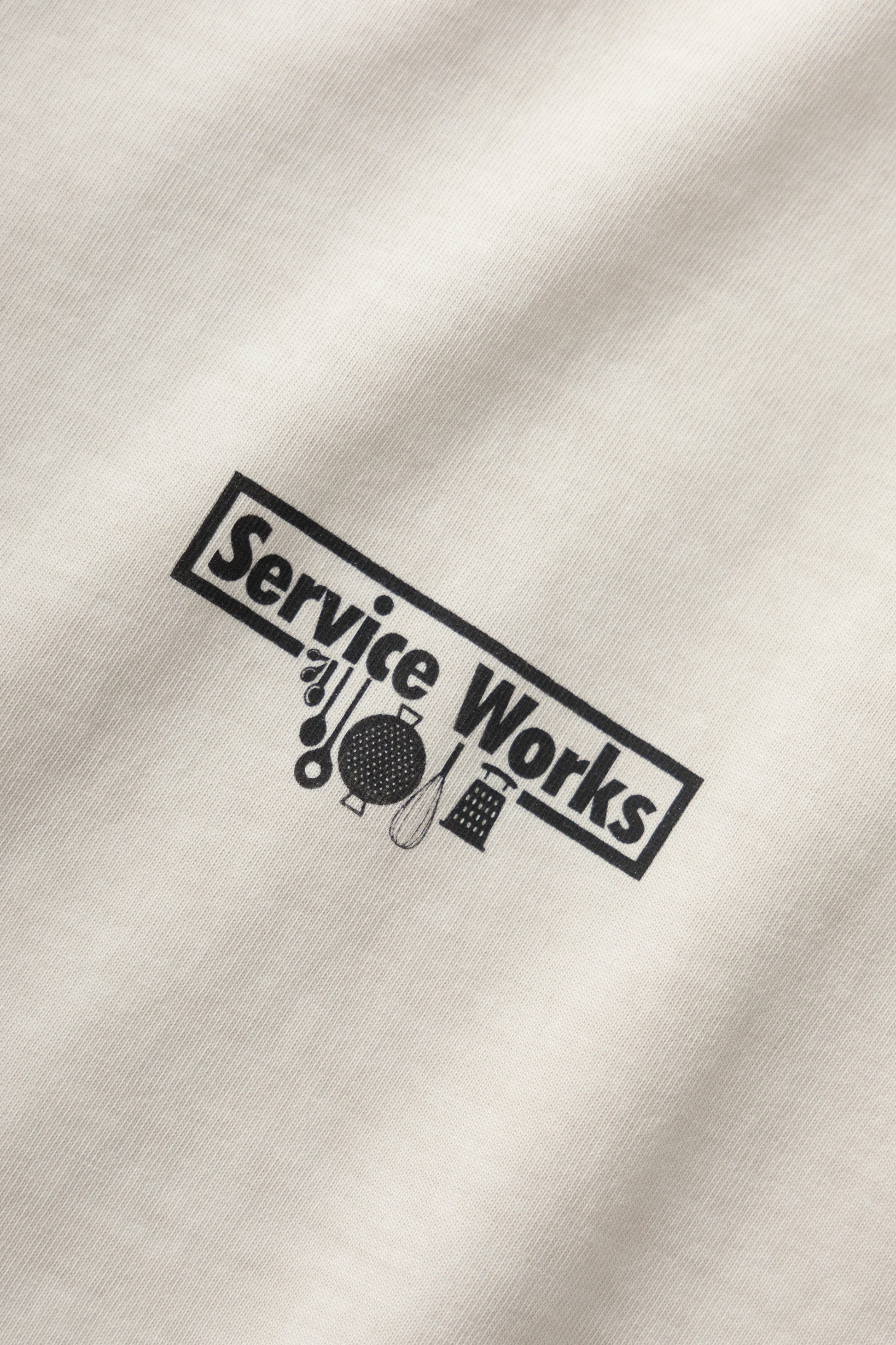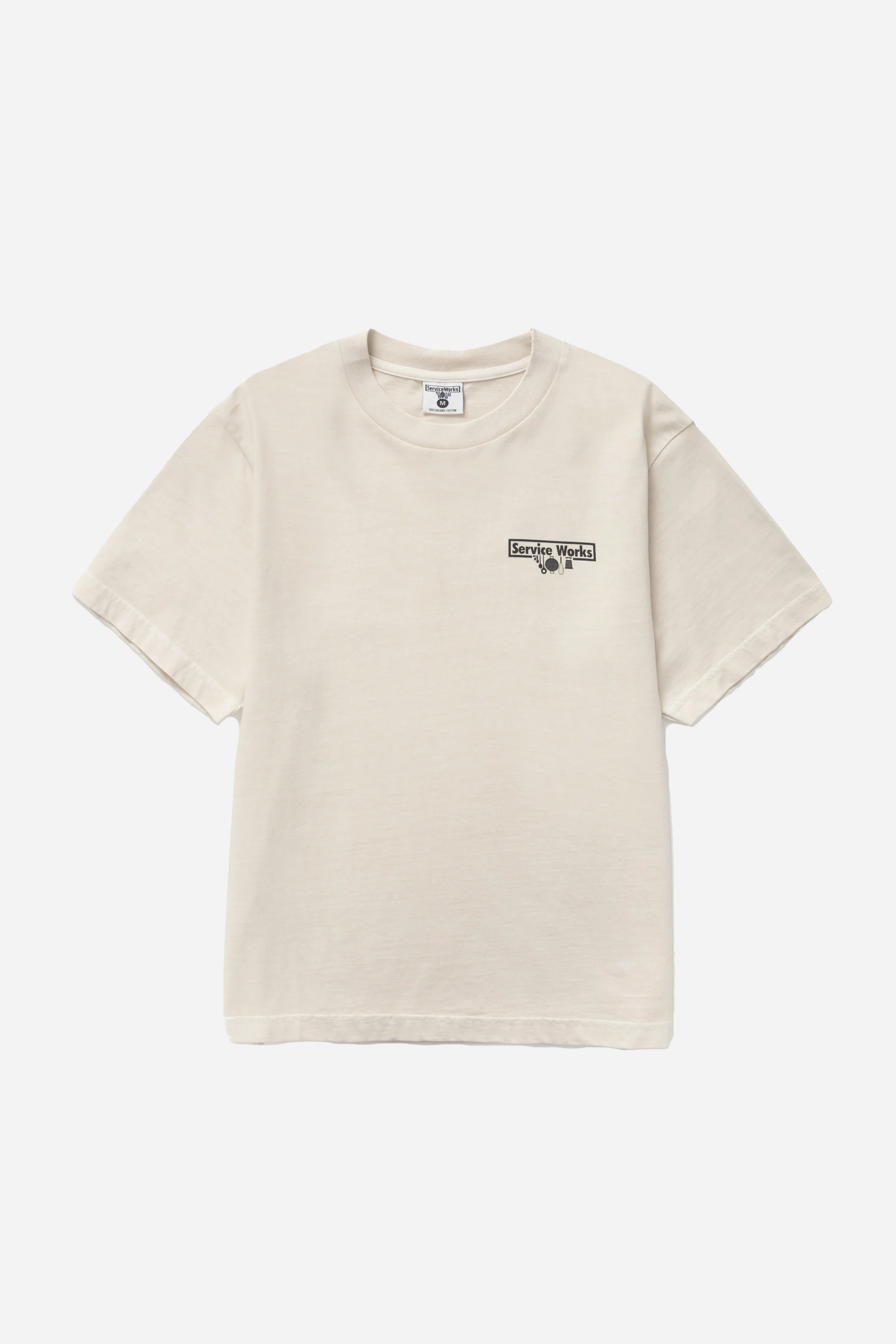 Pigment Dyed Tee Natural fra Service Works. Denne t-shirt er fremstillet i bomuld. Den er designet i en normal pasform, korte ærmer med en rund halsudskæring. T-shirten har et Service Works Logo print på venstre bryst.