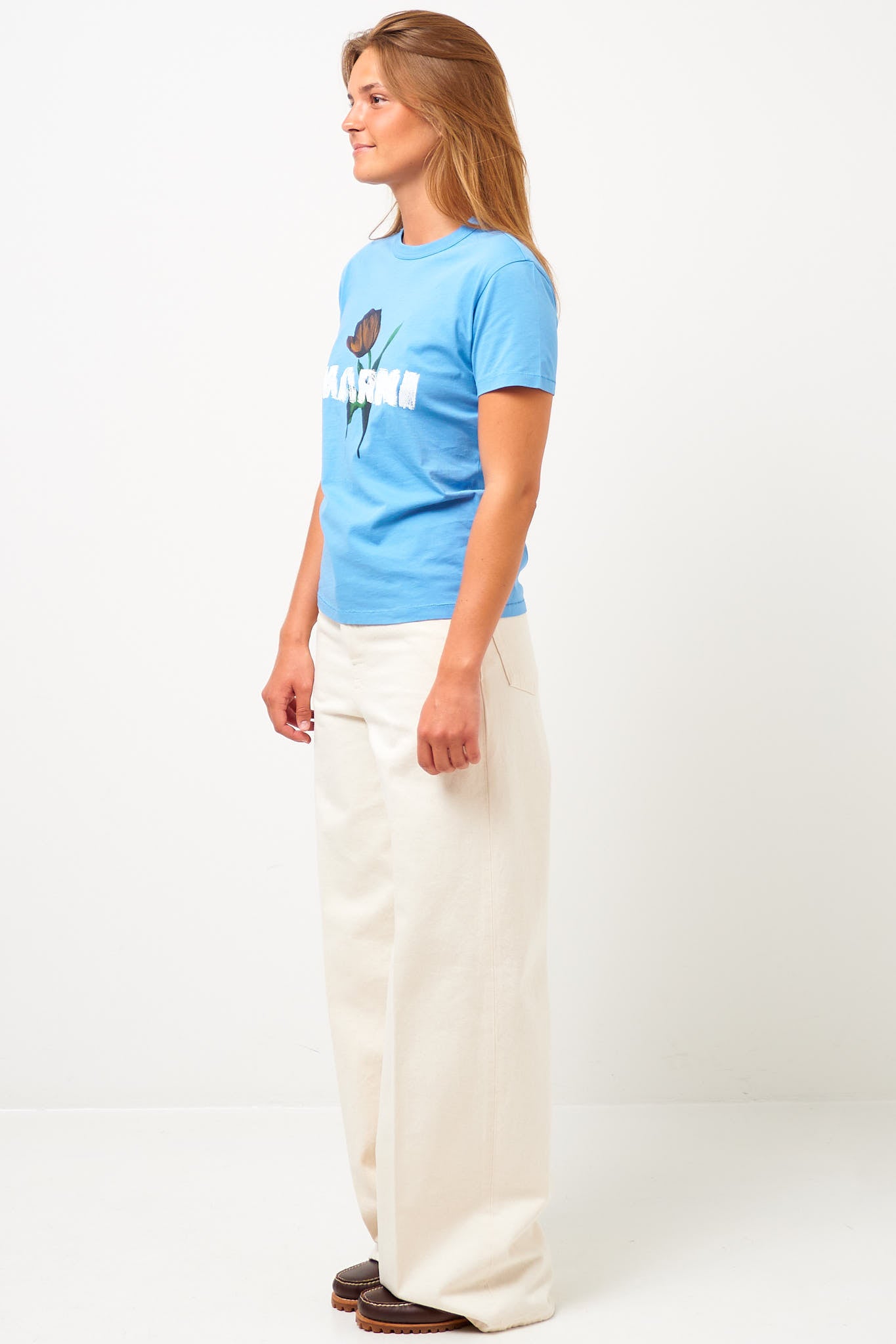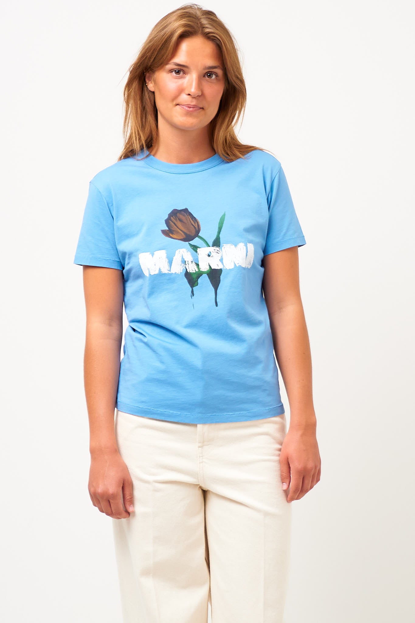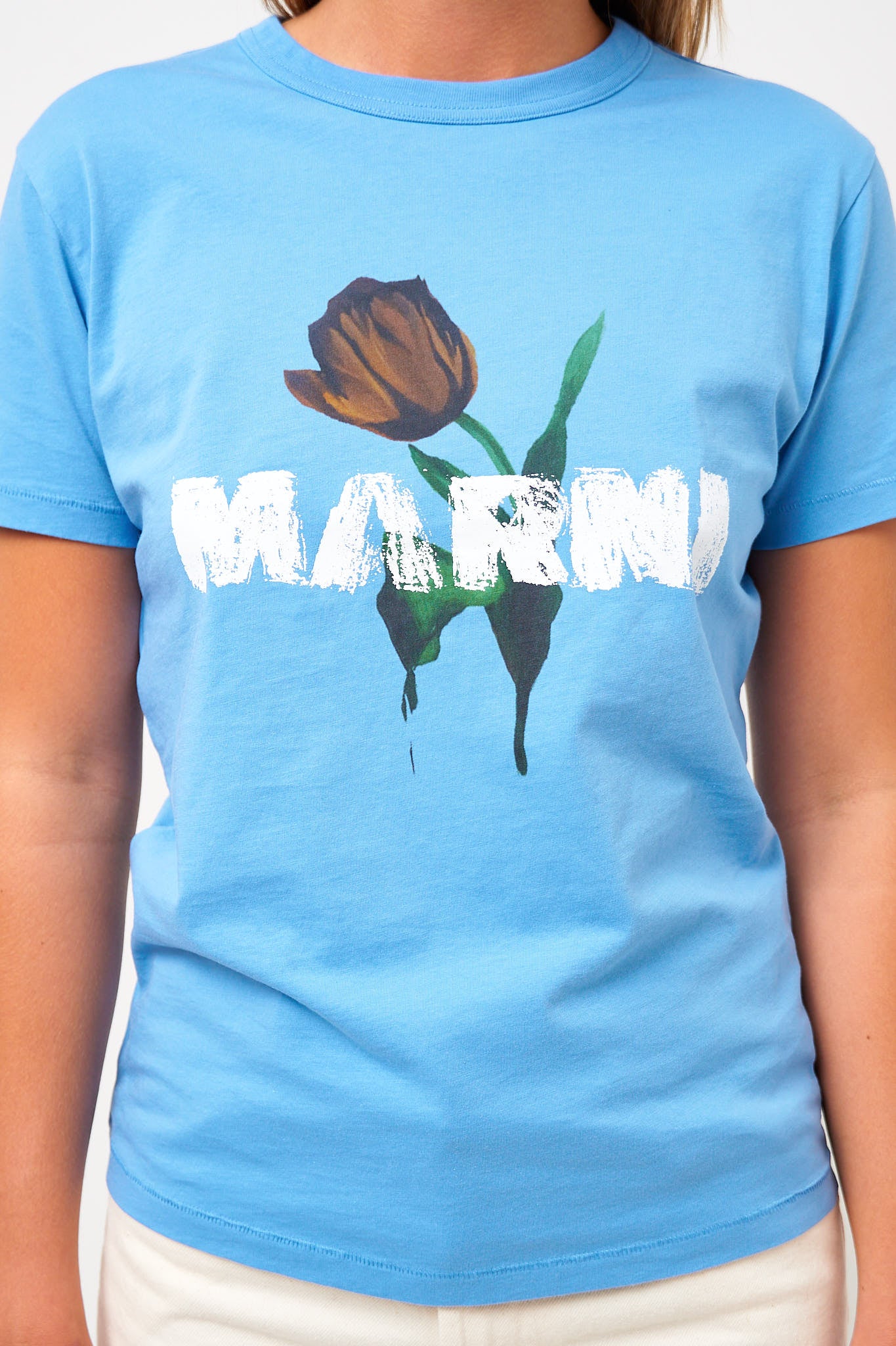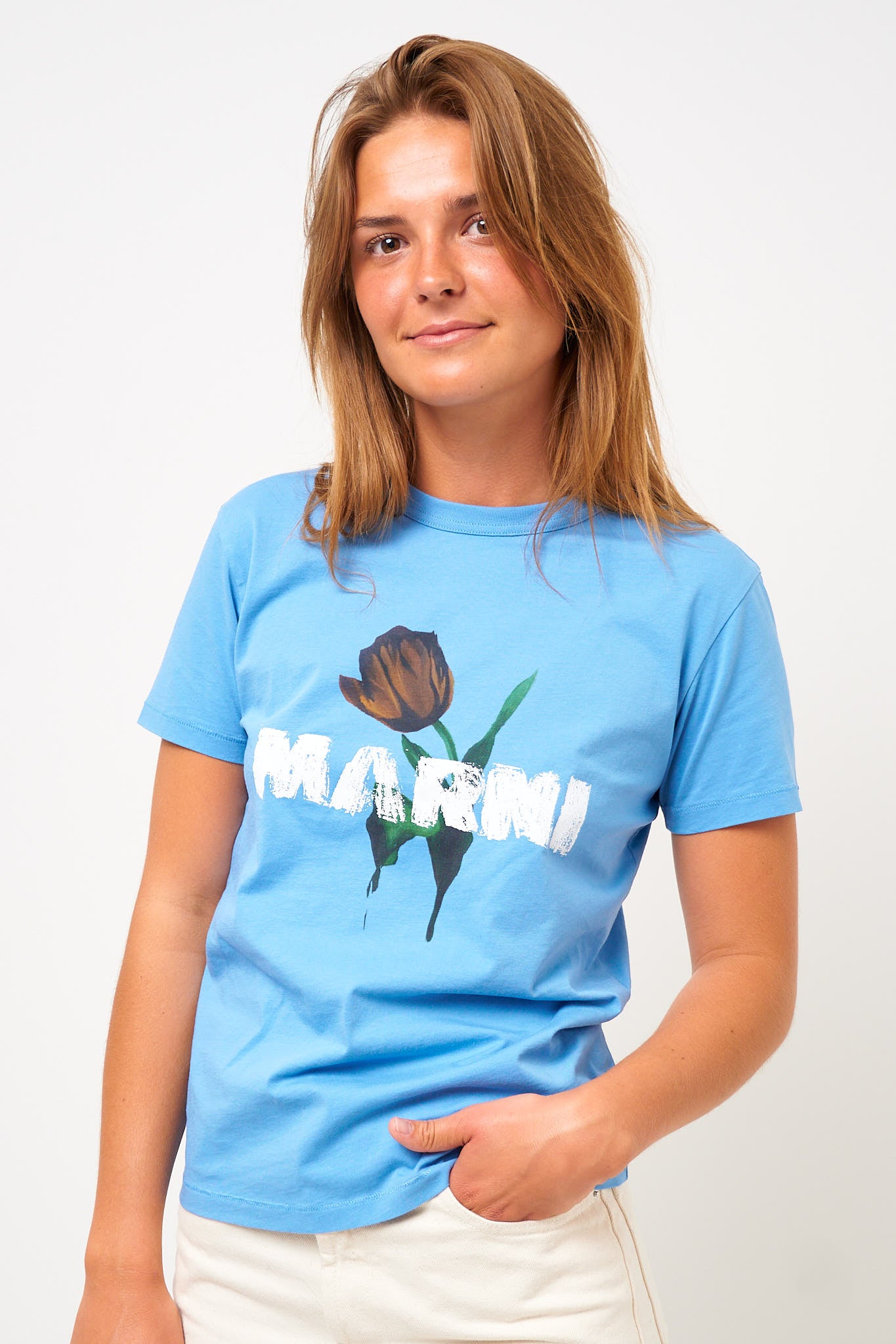 Tulip Print T-Shirt Iris Blue fra Marni. Denne t-shirt er fremstillet i en blød bomuld. T-shirten har korte ærmer og en rund halsudskæring. Den er designet med et større print fortil.