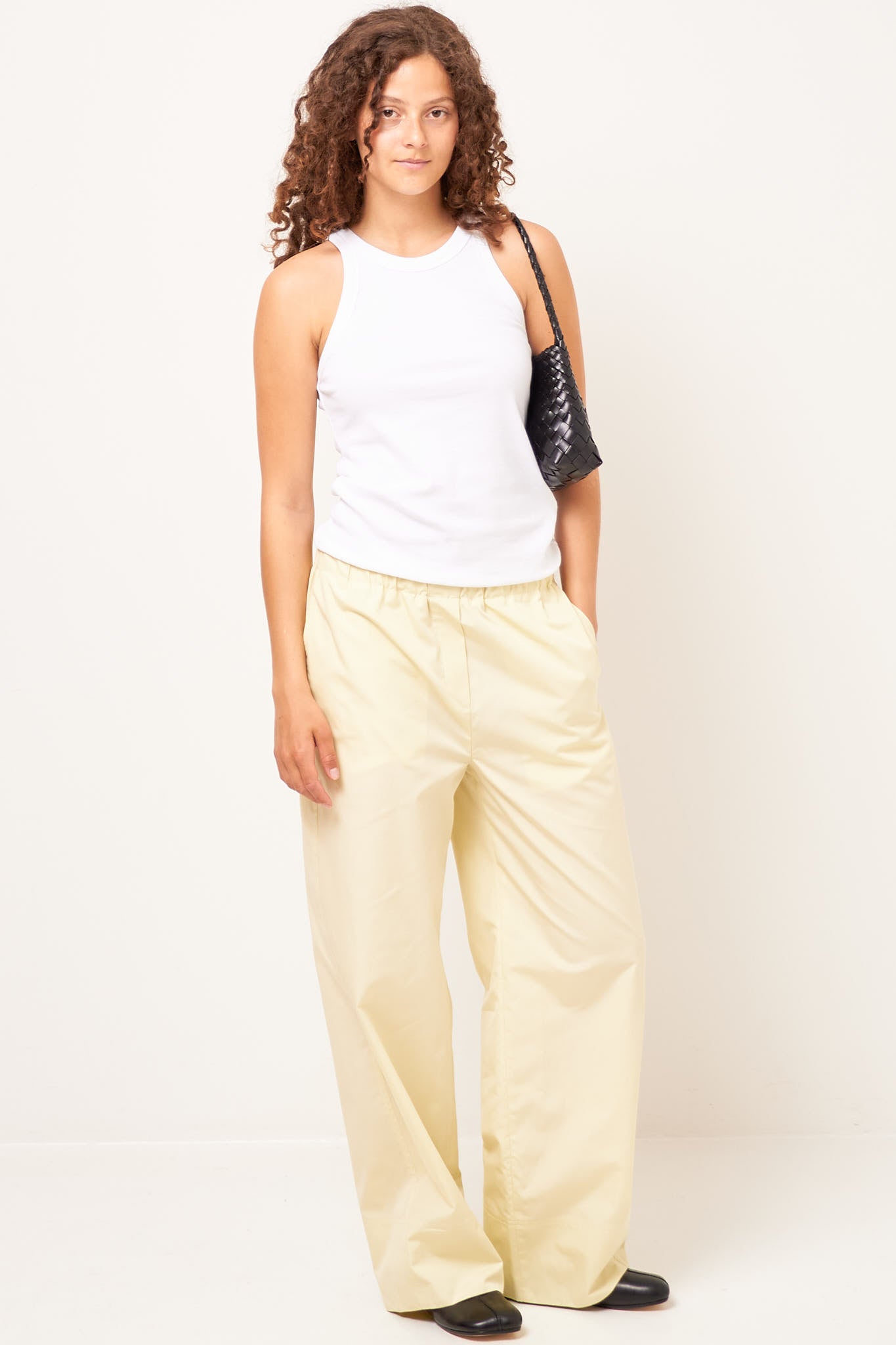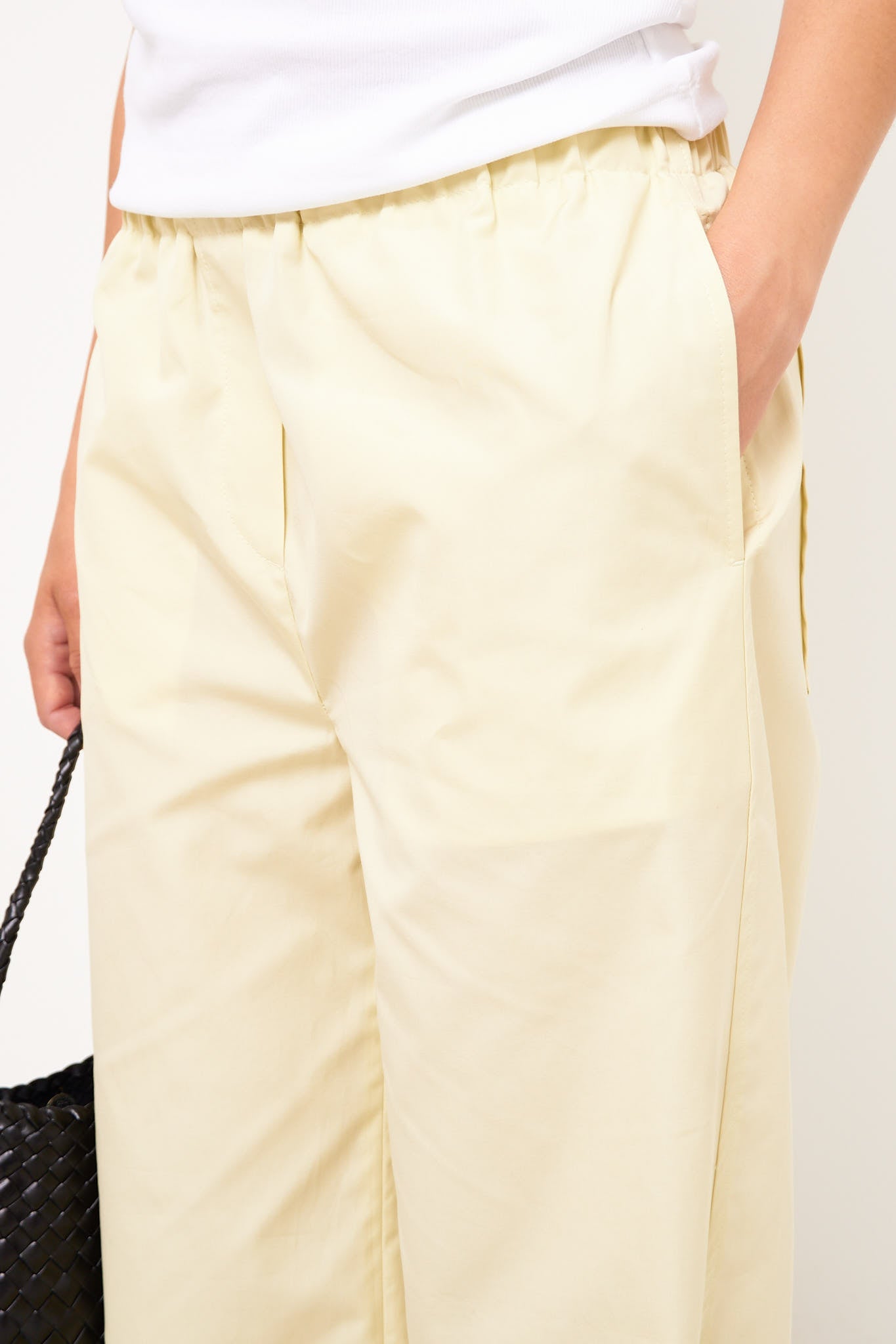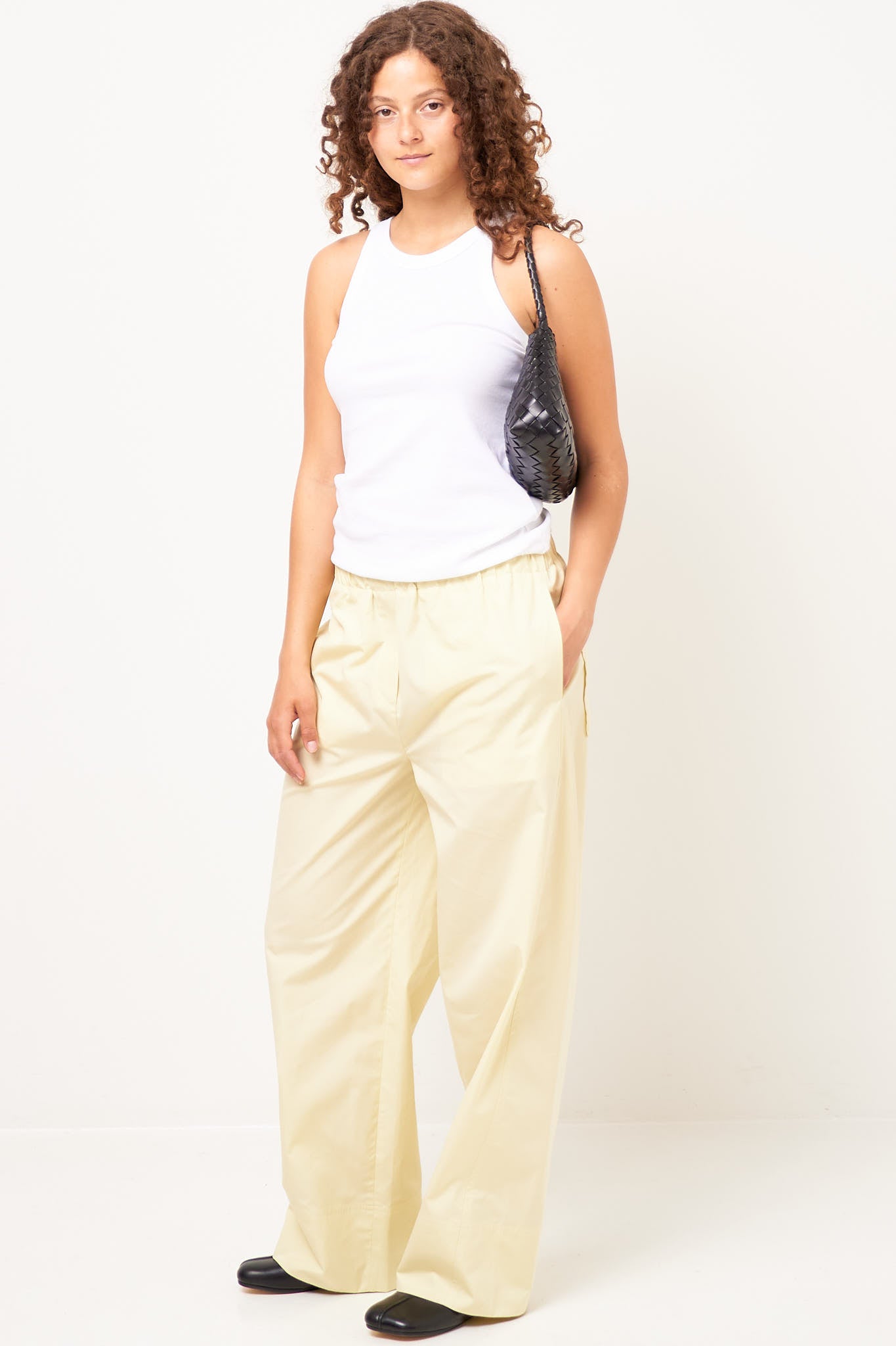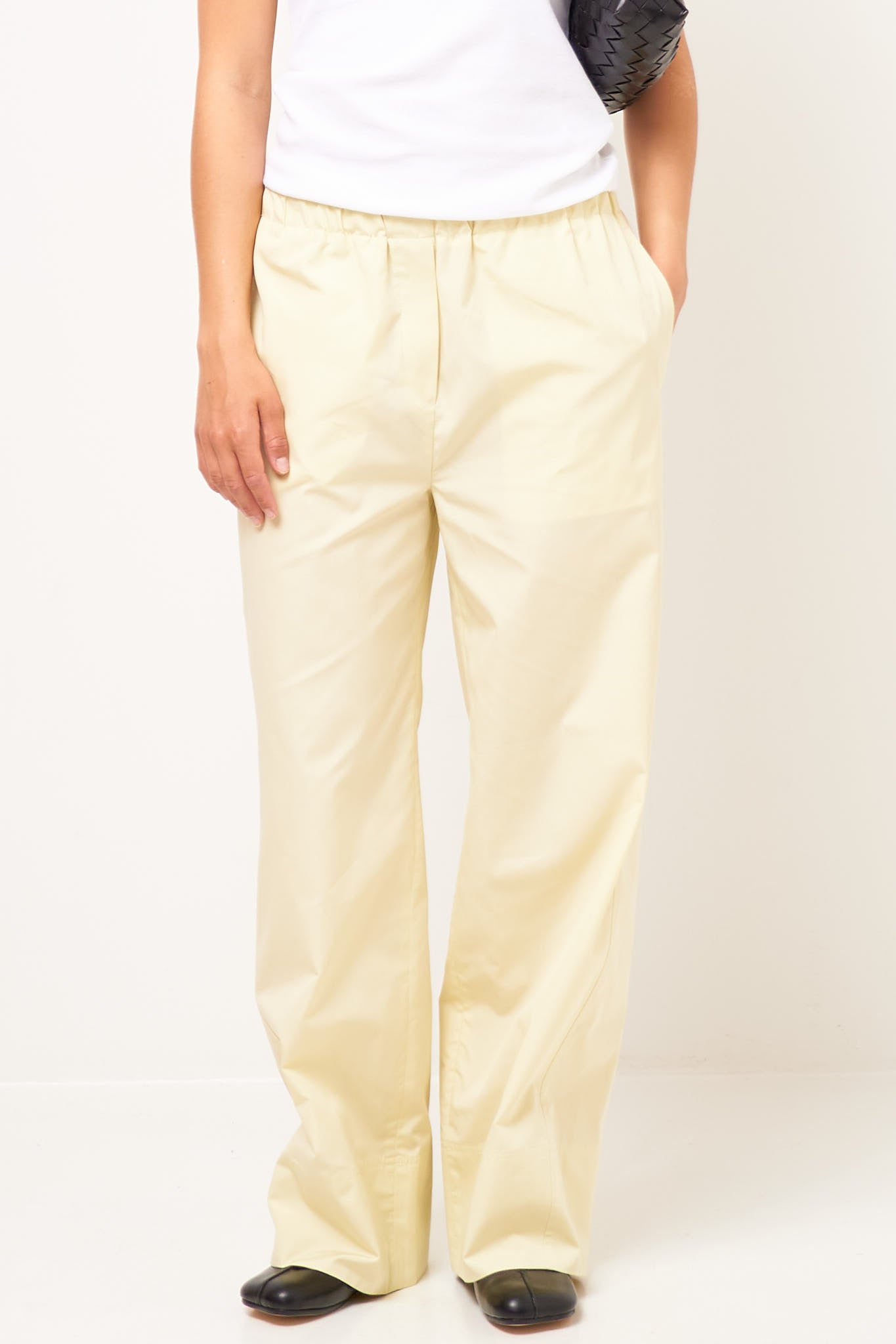 Twisted Seam Boxer Trousers Straw fra TOTEME. Disse bukser er fremstillet i en bomuldpoplin. De har en afslappet pasform med elastik i taljen, skrå sidelommer og to større baglommer.