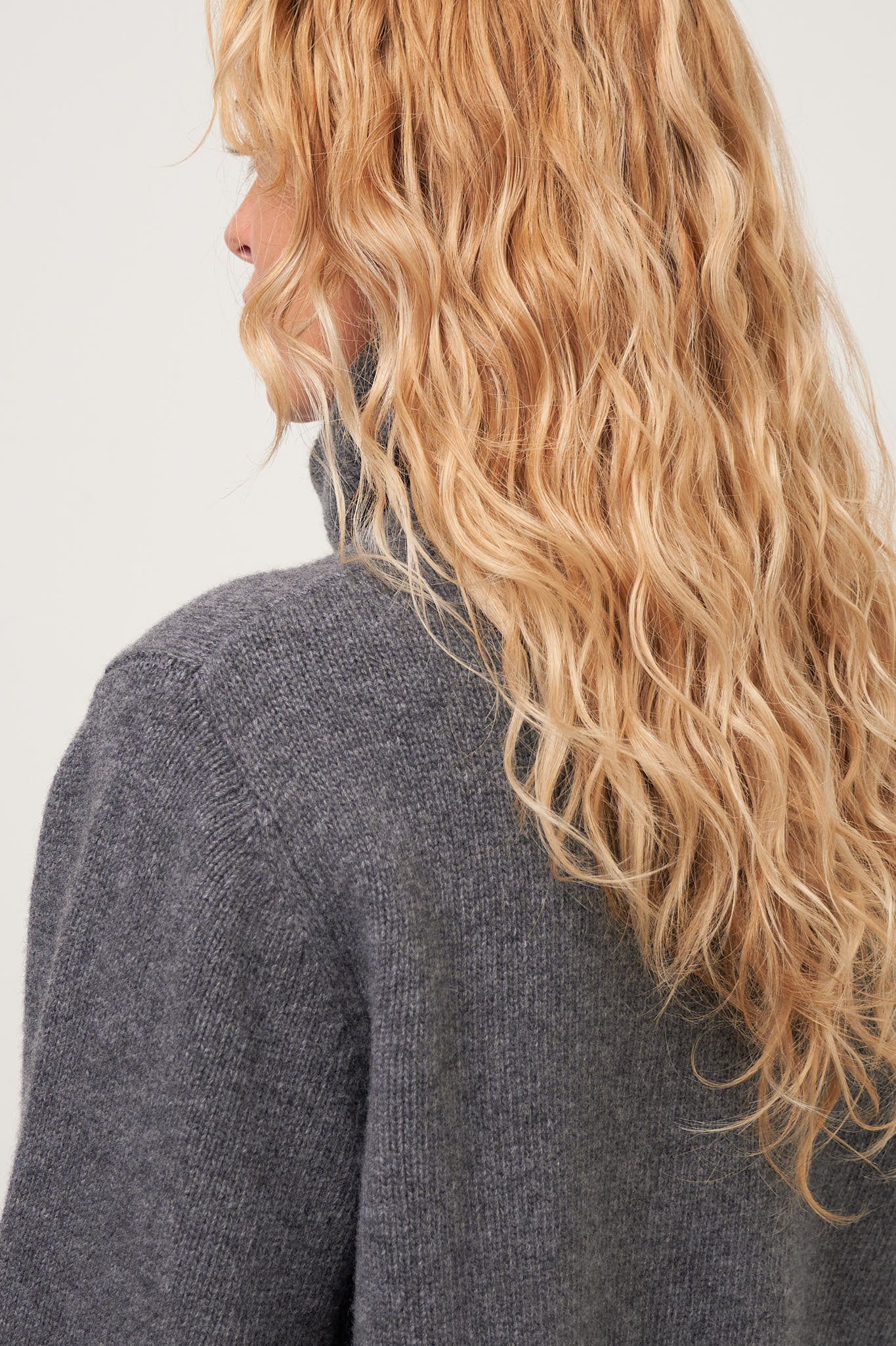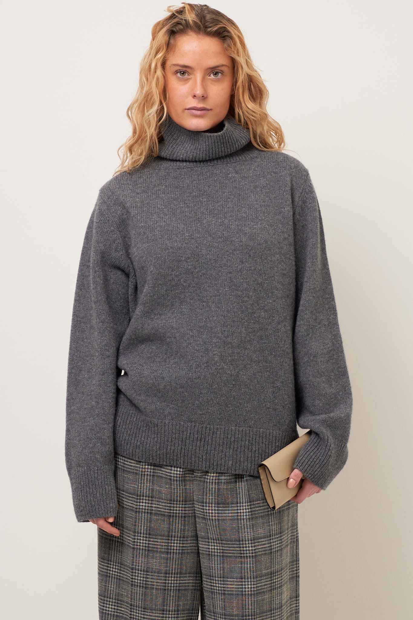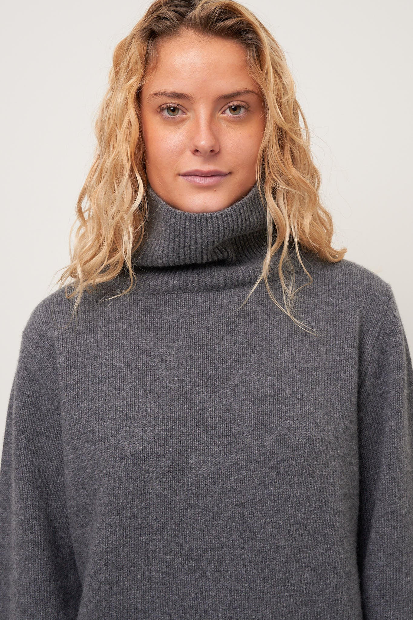 Visse Roll Neck Sweater Anthracite Grey fra STRØM. Denne striktrøje er produceret i Italien og er fremstillet i 100% supersoft marino uld. Den har en oversized pasform med sænkede skuldre og høj hals. Strikken er designet med brede ribstrikkede kanter i halsen, ved ærmerne og forneden.