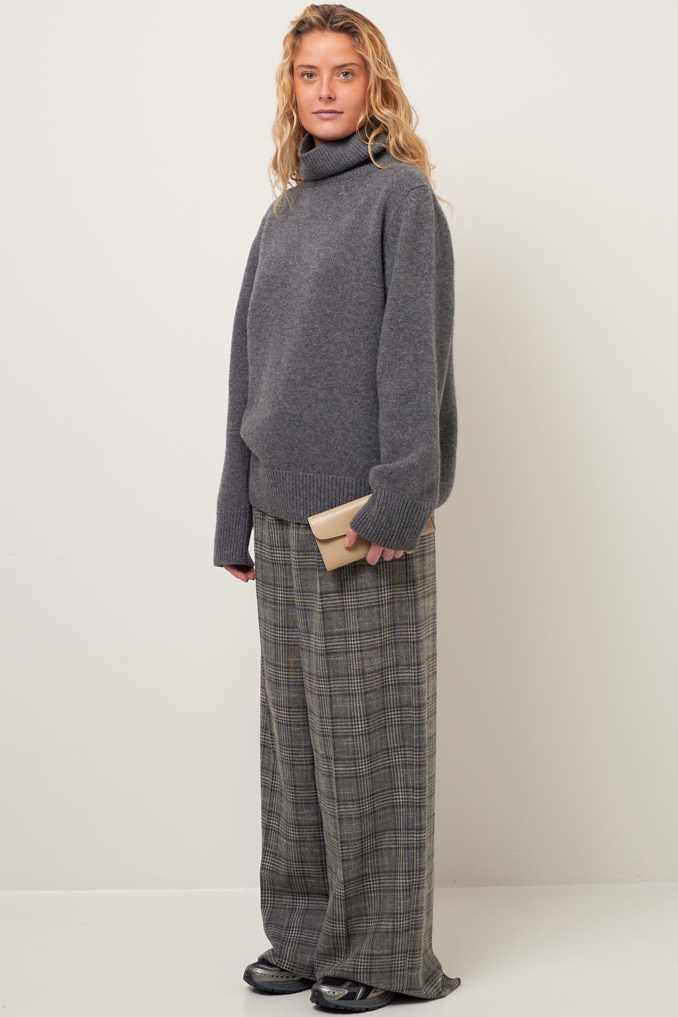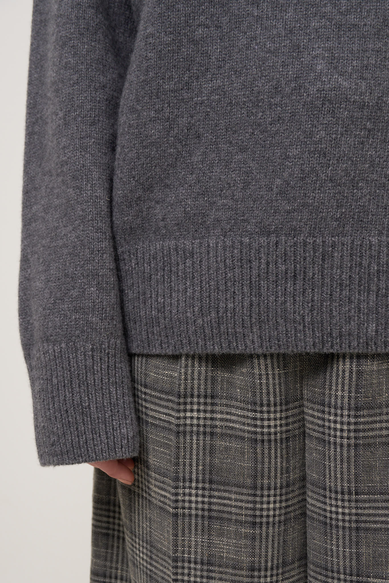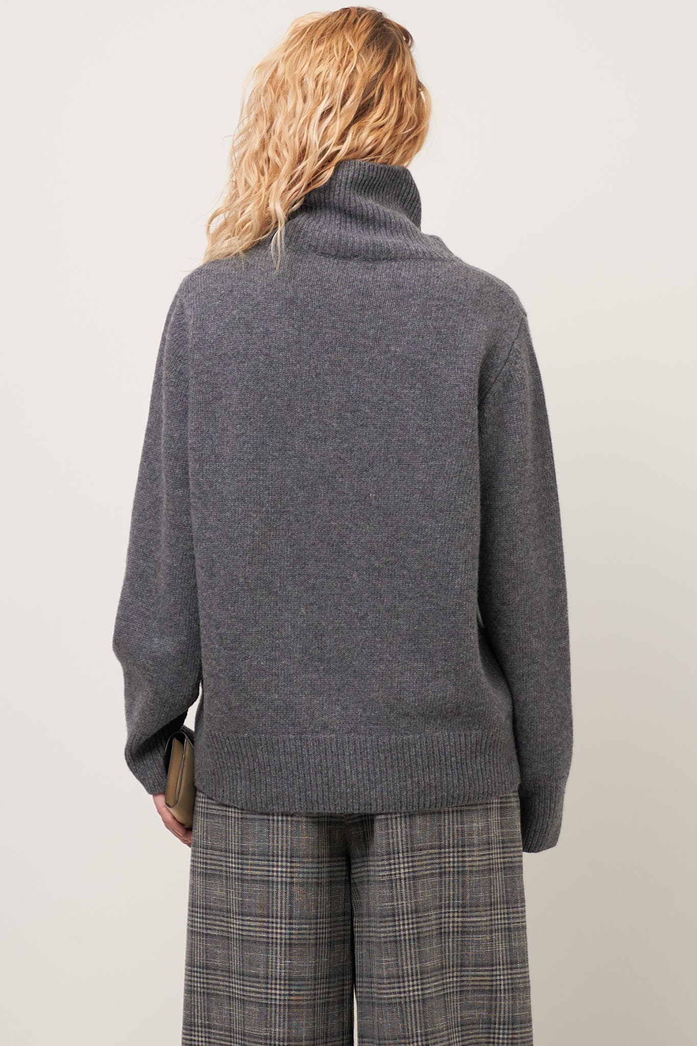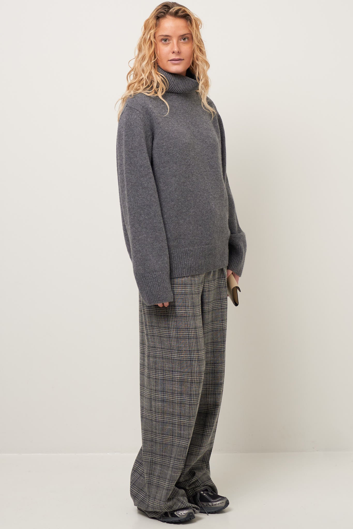Visse Roll Neck Sweater Anthracite Grey fra STRØM. Denne striktrøje er produceret i Italien og er fremstillet i 100% supersoft marino uld. Den har en oversized pasform med sænkede skuldre og høj hals. Strikken er designet med brede ribstrikkede kanter i halsen, ved ærmerne og forneden.