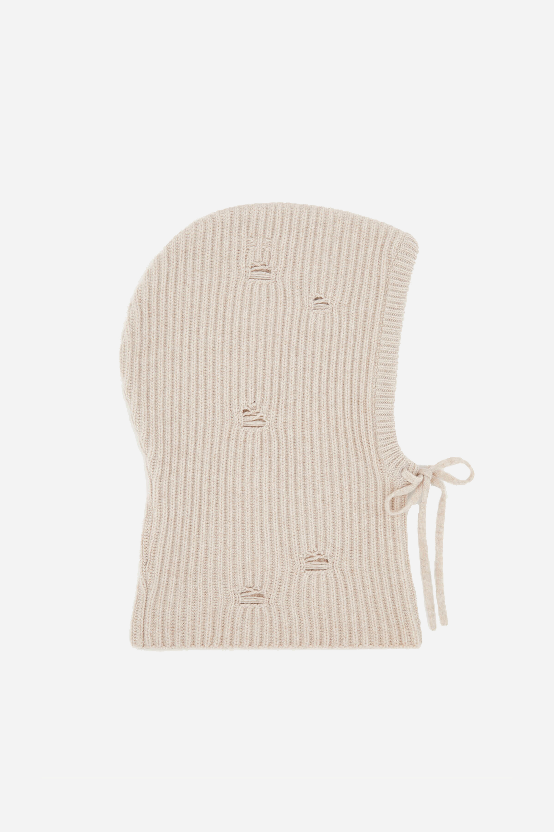 Wool Hood Nude fra MM6 Maison Margiela. Denne hue er fremstillet i en uld blanding. Den er designet med en hætte, og distressed huller for detaljer. Den har snøre under hagen, og et påsyet MM6 Maison Margiela logo.