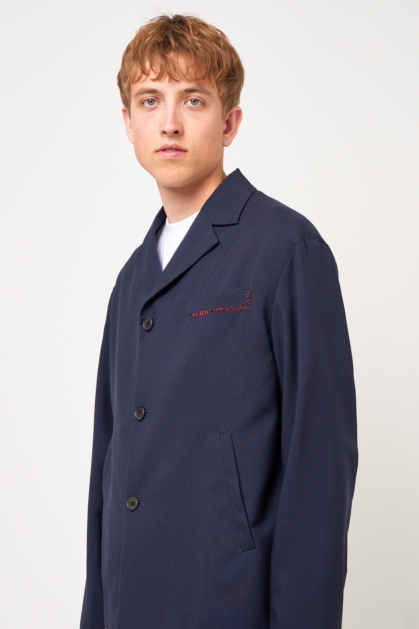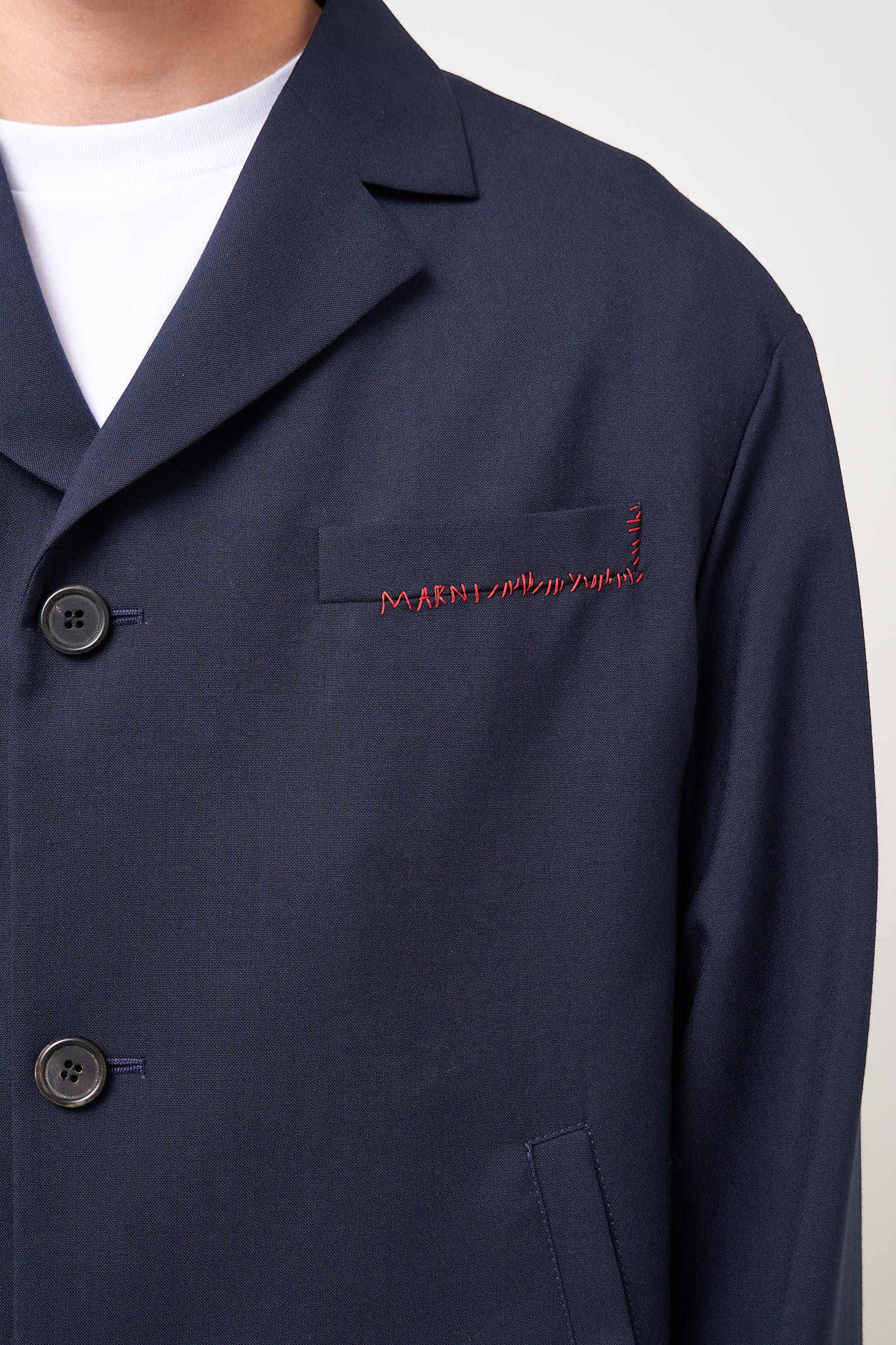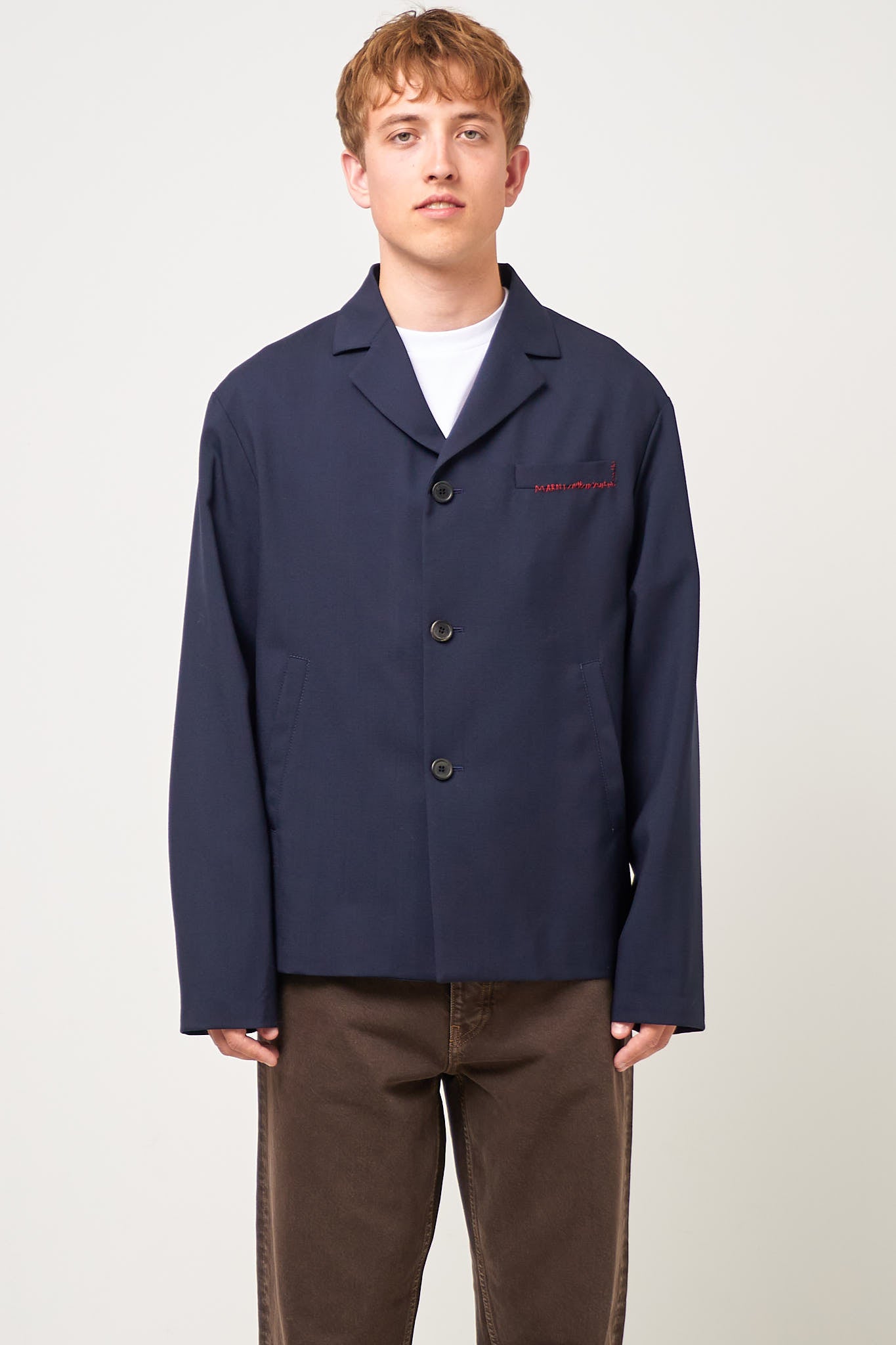Wool Jacket Marni Symbol Blue Black fra Marni. Denne jakke er fremstillet i en fin uld. Jakken har en normal pasform med en enkelt brystlomme med et Marni logo på. Jakken lukkes med knapper.